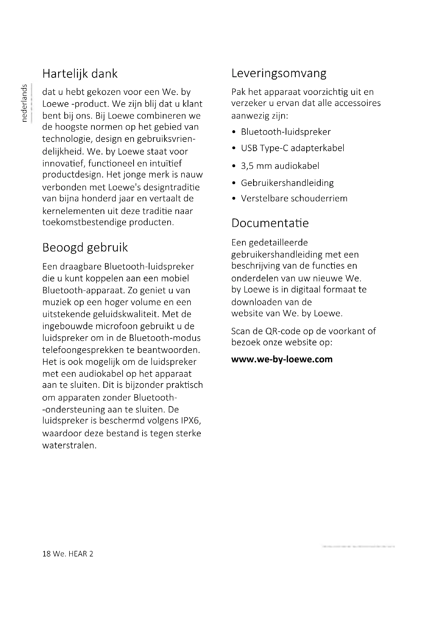 indicator light will go out. 9 IPX6 water protecon This device has IPX6 protecon, which means that strong water jets will not have harmful eects on it. For this protecon to be eecve, no external devices may be connected to the speaker via cables (such as phone via audio cable or charger via USB cable) and connector compartment must be rmly sealed.We. HEAR 2 17 english Troubleshoong In the event of a device failure, we recommend that you check the list below before calling the helpline. Problem Possible cause Remedy/notes Can’t turn the speaker on. Baery level may be very low. Charge the speaker. Speaker charging me takes too long. Your USB charger is supplying too low current. Use 5V/2A USB charger. No sound from the speaker a. Volume is too low or muted. b. No device is paired with the speaker. a. Press volume (+) buon several mes or increase volume in your device. b. Pair and connect your Bluetooth device. Sound is distorted a. Your Bluetooth device is too far from the speaker b. There is wireless inter- ference a. Move your device closer to the speaker b. Move the speaker away from other wireless devices. Technical data We. by Loewe device type: We. HEAR 2 Part number: 60702x10 Battery type: Built-in Li-ion 7,4V/4000mAh Charging current: 5V / 2A Playing time: 15 – 17h Charging time: 4 – 5h Speaker Unit 2x 15 W RMS Water protection IPX6 Bluetooth version V5.0 Bluetooth power/frequency range: Maximum power <10 mW at 2402 - 2480 MHz Bluetooth protocols: A2DP, AVRCP Device dimensions (W x H x D): 118 x 290 x 112 mm Device weight: 2 kg Ambient temperature: 0° C – 40° C Relative humidity (non-condensing): 20 – 70%18 We. HEAR 2 nederlands Hartelijk dank dat u hebt gekozen voor een We. by Loewe -product. We zijn blij dat u klant bent bij ons. Bij Loewe combineren we de hoogste normen op het gebied van technologie, design en gebruiksvrien- delijkheid. We. by Loewe staat voor innovaef, funconeel en intuïef productdesign. Het jonge merk is nauw verbonden met Loewe's designtradie van bijna honderd jaar en vertaalt de kernelementen uit deze tradie naar toekomstbestendige producten. Beoogd gebruik Een draagbare Bluetooth-luidspreker die u kunt koppelen aan een mobiel Bluetooth-apparaat. Zo geniet u van muziek op een hoger volume en een uitstekende geluidskwaliteit. Met de ingebouwde microfoon gebruikt u de luidspreker om in de Bluetooth-modus telefoongesprekken te beantwoorden. Het is ook mogelijk om de luidspreker met een audiokabel op het apparaat aan te sluiten. Dit is bijzonder praksch om apparaten zonder Bluetooth- -ondersteuning aan te sluiten. De luidspreker is beschermd volgens IPX6, waardoor deze bestand is tegen sterke waterstralen. Leveringsomvang Pak het apparaat voorzichg uit en verzeker u ervan dat alle accessoires aanwezig zijn: