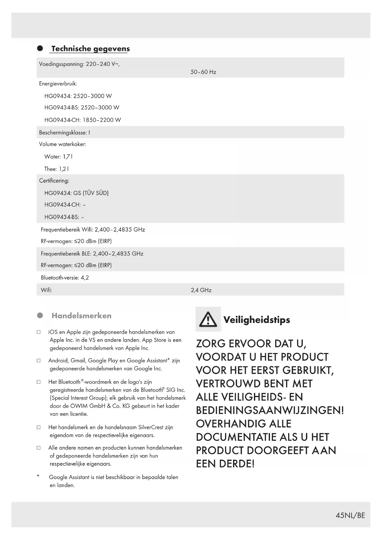 [2] [3] [1] Vulklep [2] Deksel [3] Theezeef met greep [4] Waterkoker [5] Greep [6] Aansluitsnoer met netstekker [7] Voet (met netsnoergeleiding en kabelhaspel) [8] Toets (toets aan/uit met lichtindicator) [9] Toets (toets Wifi met lichtindicator) [] LED-ring [] Waterstandsaanduiding [] Tuit [] Zeef (in het product)45NL/BE Technische gegevens Voedingsspanning: 220–240 V∼, 50–60Hz Energieverbruik: HG09434: 2520–3000W HG09434-BS: 2520–3000W HG09434-CH: 1850–2200W Beschermingsklasse: I Volume waterkoker: Water: 1,7 l Thee: 1,2 l Certificering: HG09434: GS (TÜV SÜD) HG09434-CH: ‒ HG09434-BS: ‒ Frequentiebereik Wifi: 2,400‒2,4835 GHz RF-vermogen: ≤20dBm(EIRP) Frequentiebereik BLE: 2,400‒2,4835 GHz RF-vermogen: ≤20dBm(EIRP) Bluetooth-versie: 4,2 Wifi: 2,4 GHz Handelsmerken o iOS en Apple zijn gedeponeerde handelsmerken van Apple Inc. in de VS en andere landen. AppStore is een gedeponeerd handelsmerk van AppleInc. o Android, Gmail, Google Play en Google Assistant* zijn gedeponeerde handelsmerken van Google Inc. o Het Bluetooth