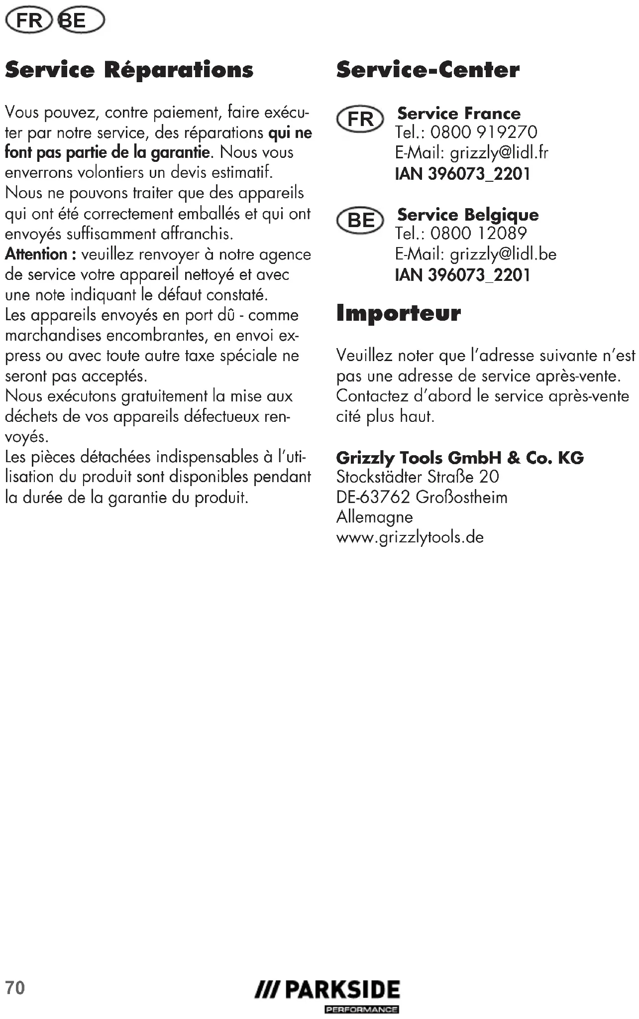 - Bewaar het apparaat en de accessoi- resindebgeleverdekoffer(23). Verwerking en milieubescherming Neem de accu uit het apparaat en lever het apparaat, de accu, toebehoren en verpakking invooreenmilieuvriendelkeverwerking. Elektrischeapparatenhorenniet thuisbhethuisvuil. Werpdeaccunietbhethuisvuil,in hetvuur(ontplofngsgevaar)ofinhet water.Beschadigdeaccu’skunnen het milieu en uw gezondheid schaden als er giftige dampen of vloeistoffen ontsnappen. Voeraccu’safvolgensdeplaatselke voorschriften.Defecteofgebruikteaccu’s moetenvolgensrichtln2006/66/EG gerecycledworden.Brengaccu’sbinnen beeninzamelpuntvooroudeaccu’s, waarzevoormilieuvriendelkerecyclage wordenverwerkt.Vraaghiervoorraadb uwplaatselkeafvalmaatschappofb ons servicecenter. Voeraccu’sinontladentoestandaf.We raden aan om de polen af te dekken met tape ter bescherming tegen kortsluiting. Open de accu niet. Reserveonderdelen/ accessoires Reserveonderdelen en accessoires verkrgt u op www.grizzlytools.shop Ondervindtuproblemenbhetorderpro- ces, gebruik dan het contactformulier. Banderevragenneemtucontactopmet het“Service-Center”(ziepag.91). Zaagblad, Ø140mmx1,8xØ20mm ......13800414NL BE
