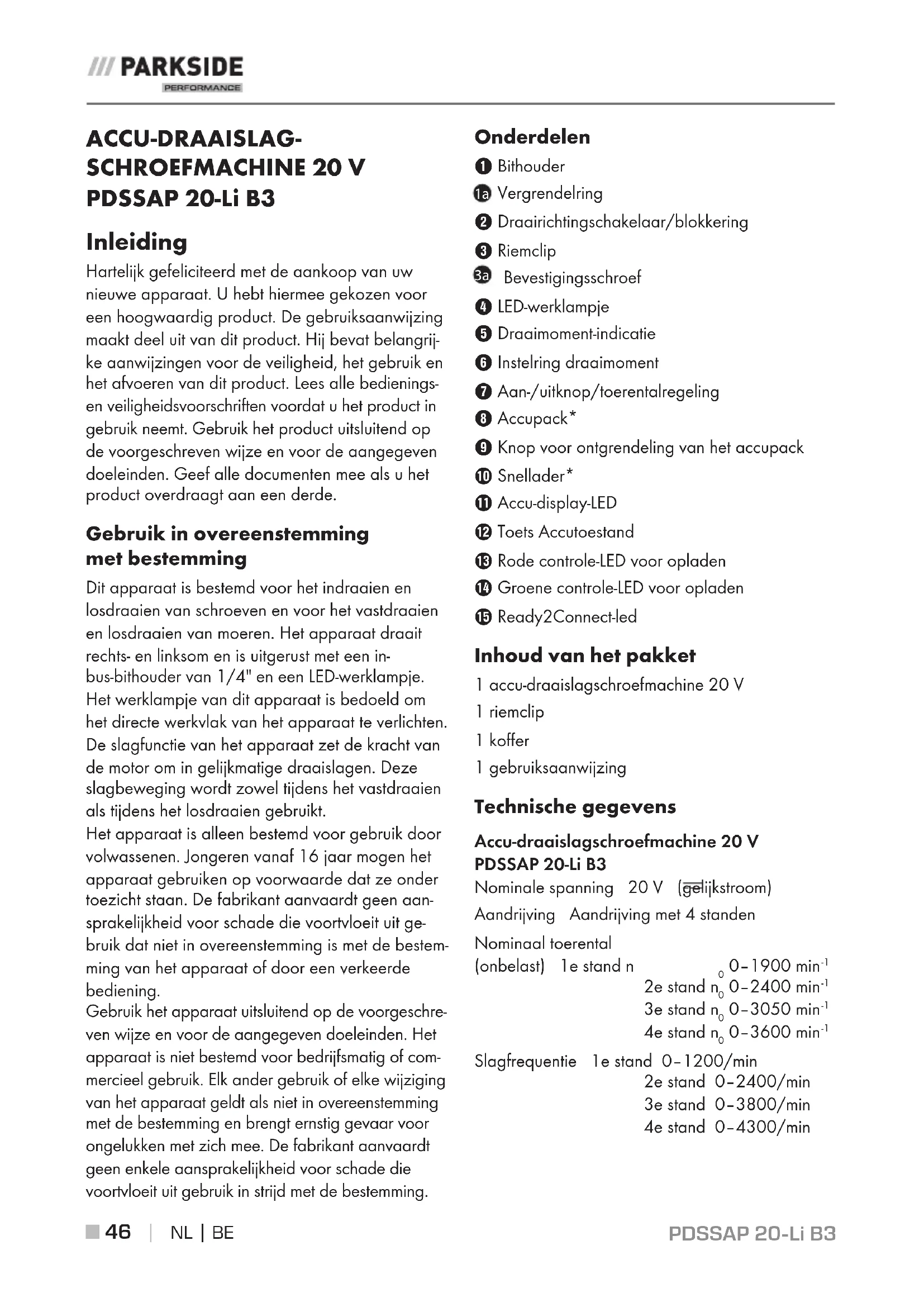 ACCU-DRAAISLAG- SCHROEFMACHINE 20 V PDSSAP 20-Li B3 Inleiding Hartelijk gefeliciteerd met de aankoop van uw nieuwe apparaat. U hebt hiermee gekozen voor een hoogwaardig product. De gebruiksaanwijzing maakt deel uit van dit product. Hij bevat belangrij- ke aanwijzingen voor de veiligheid, het gebruik en het afvoeren van dit product. Lees alle bedienings- en veiligheidsvoorschriften voordat u het product in gebruik neemt. Gebruik het product uitsluitend op de voorgeschreven wijze en voor de aangegeven doeleinden. Geef alle documenten mee als u het product overdraagt aan een derde. Gebruik in overeenstemming met bestemming Dit apparaat is bestemd voor het indraaien en losdraaien van schroeven en voor het vastdraaien en losdraaien van moeren. Het apparaat draait rechts- en linksom en is uitgerust met een in- bus-bithouder van 1/4" en een LED-werklampje. Het werklampje van dit apparaat is bedoeld om het directe werkvlak van het apparaat te verlichten. De slagfunctie van het apparaat zet de kracht van de motor om in gelijkmatige draaislagen. Deze slagbeweging wordt zowel tijdens het vastdraaien als tijdens het losdraaien gebruikt. Het apparaat is alleen bestemd voor gebruik door volwassenen. Jongeren vanaf 16 jaar mogen het apparaat gebruiken op voorwaarde dat ze onder toezicht staan. De fabrikant aanvaardt geen aan- sprakelijkheid voor schade die voortvloeit uit ge- bruik dat niet in overeenstemming is met de bestem- ming van het apparaat of door een verkeerde bediening. Gebruik het apparaat uitsluitend op de voorgeschre- ven wijze en voor de aangegeven doeleinden. Het apparaat is niet bestemd voor bedrijfsmatig of com- mercieel gebruik. Elk ander gebruik of elke wijziging van het apparaat geldt als niet in overeenstemming met de bestemming en brengt ernstig gevaar voor ongelukken met zich mee. De fabrikant aanvaardt geen enkele aansprakelijkheid voor schade die voortvloeit uit gebruik in strijd met de bestemming. Onderdelen 1 Bithouder