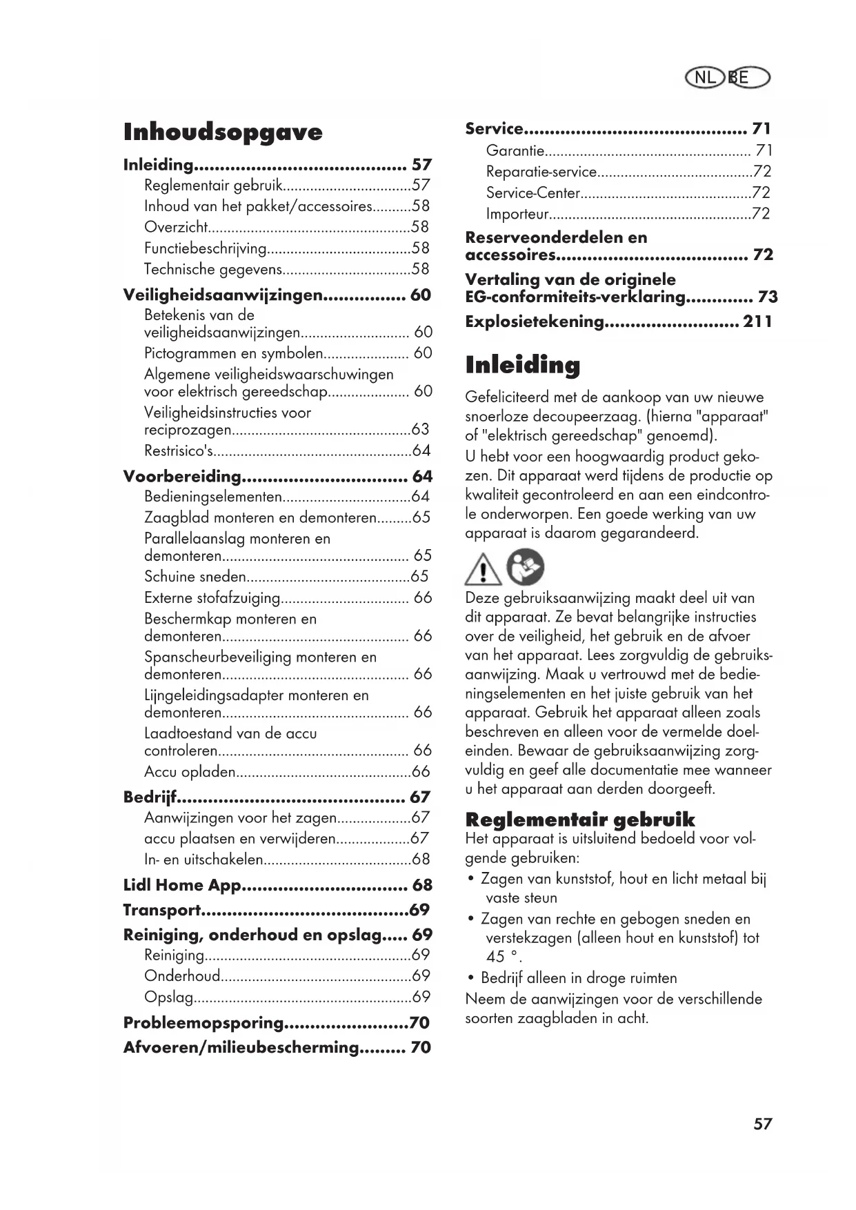 - Explosietekening Inleiding Gefeliciteerd met de aankoop van uw nieuwe snoerloze decoupeerzaag. (hierna "apparaat" of "elektrisch gereedschap" genoemd). U hebt voor een hoogwaardig product geko- zen. Dit apparaat werd tijdens de productie op kwaliteit gecontroleerd en aan een eindcontro- le onderworpen. Een goede werking van uw apparaat is daarom gegarandeerd. Deze gebruiksaanwijzing maakt deel uit van dit apparaat. Ze bevat belangrijke instructies over de veiligheid, het gebruik en de afvoer van het apparaat. Lees zorgvuldig de gebruiks- aanwijzing. Maak u vertrouwd met de bedie- ningselementen en het juiste gebruik van het apparaat. Gebruik het apparaat alleen zoals beschreven en alleen voor de vermelde doel- einden. Bewaar de gebruiksaanwijzing zorg- vuldig en geef alle documentatie mee wanneer u het apparaat aan derden doorgeeft. Reglementair gebruik Het apparaat is uitsluitend bedoeld voor vol- gende gebruiken: p. 211