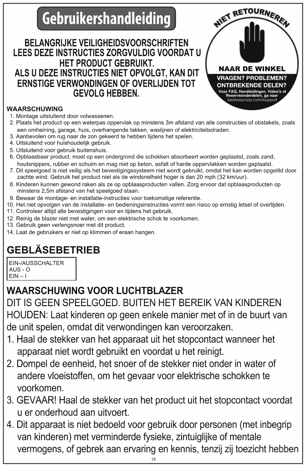 GEVOLG HEBBEN. WAARSCHUWING 1. Montage uitsluitend door volwassenen. 2. Plaats het product op een waterpas oppervlak op minstens 3m afstand van alle constructies of obstakels, zoals een omheining, garage, huis, overhangende takken, waslijnen of elektriciteitsdraden. 3. Aanbevolen om rug naar de zon gekeerd te hebben tijdens het spelen. 4. Uitsluitend voor huishoudelijk gebruik. 5. Uitsluitend voor gebruik buitenshuis. 6. Opblaasbaar product, moet op een ondergrond die schokken absorbeert worden geplaatst, zoals zand, houtsnippers, rubber en schuim en mag niet op beton, asfalt of harde oppervlakken worden geplaatst. 7. Dit speelgoed is niet veilig als het bevestigingssysteem niet wordt gebruikt, omdat het kan worden opgetild door zachte wind. Gebruik het product niet als de windsnelheid hoger is dan 20 mph (32 km/uur). 8. Kinderen kunnen gewond raken als ze op opblaasproducten vallen. Zorg ervoor dat opblaasproducten op minstens 2,5m afstand van het speelgoed staan. 9. Bewaar de montage- en installatie-instructies voor toekomstige referentie.10. Het niet opvolgen van de installatie- en bedieningsinstructies vormt een risico op ernstig letsel of overlijden.11. Controleer altijd alle bevestigingen voor en tijdens het gebruik.12. Reinig de blazer niet met water, om een elektrische schok te voorkomen.13. Gebruik geen verlengsnoer met dit product.14. Laat de gebruikers er niet op klimmen of eraan hangen.