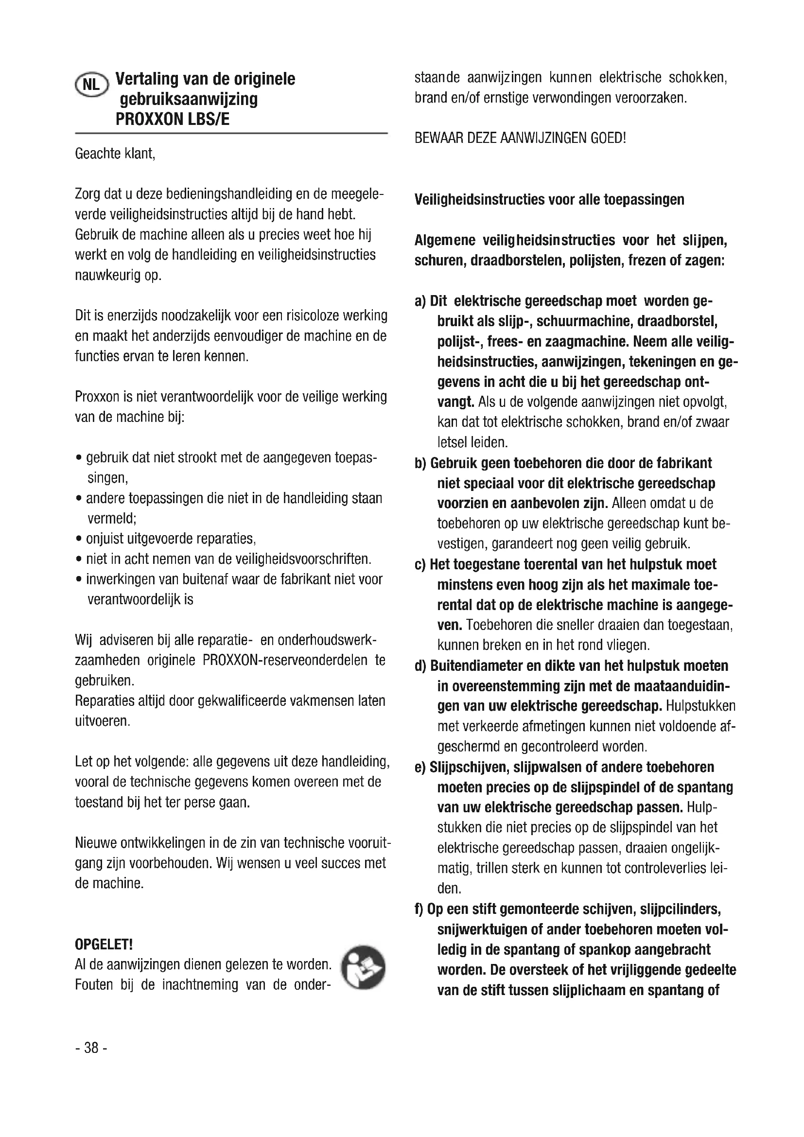 - inwerkingen van buitenaf waar de fabrikant niet voor verantwoordelijk is Wij adviseren bij alle reparatie- en onderhoudswerk- zaamheden originele PROXXON-reserveonderdelen te gebruiken. Reparaties altijd door gekwalificeerde vakmensen laten uitvoeren. Let op het volgende: alle gegevens uit deze handleiding, vooral de technische gegevens komen overeen met de toestand bij het ter perse gaan. Nieuwe ontwikkelingen in de zin van technische vooruit- gang zijn voorbehouden. Wij wensen u veel succes met de machine. OPGELET! Al de aanwijzingen dienen gelezen te worden. Fouten bij de inachtneming van de onder- staande aanwijzingen kunnen elektrische schokken,