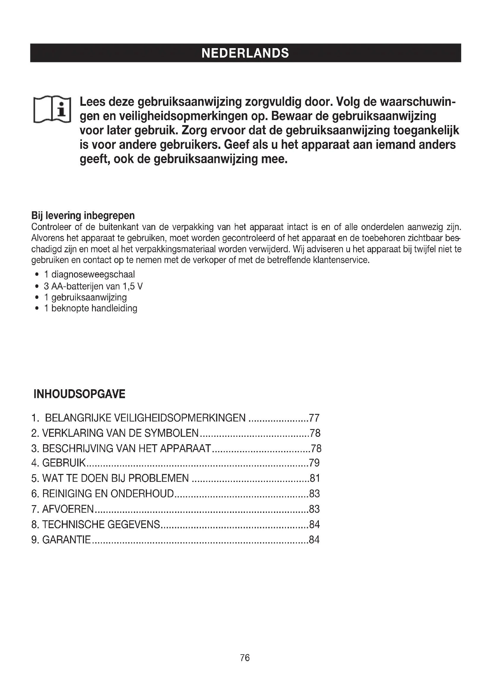 Szczegółowe informacje na temat gwarancji iwarunków gwarancji podano wzałączonej ulotce gwarancyjnej. Zastrzega się prawo do pomyłek izmian76 Lees deze gebruiksaanwijzing zorgvuldig door. Volg de waarschuwin- gen en veiligheidsopmerkingen op. Bewaar de gebruiksaanwijzing voor later gebruik. Zorg ervoor dat de gebruiksaanwijzing toegankelijk is voor andere gebruikers. Geef als u het apparaat aan iemand anders geeft, ook de gebruiksaanwijzing mee. INHOUDSOPGAVE Bij levering inbegrepen Controleer of de buitenkant van de verpakking van het apparaat intact is en of alle onderdelen aanwezig zijn. Alvorens het apparaat te gebruiken, moet worden gecontroleerd of het apparaat en de toebehoren zichtbaar bes
