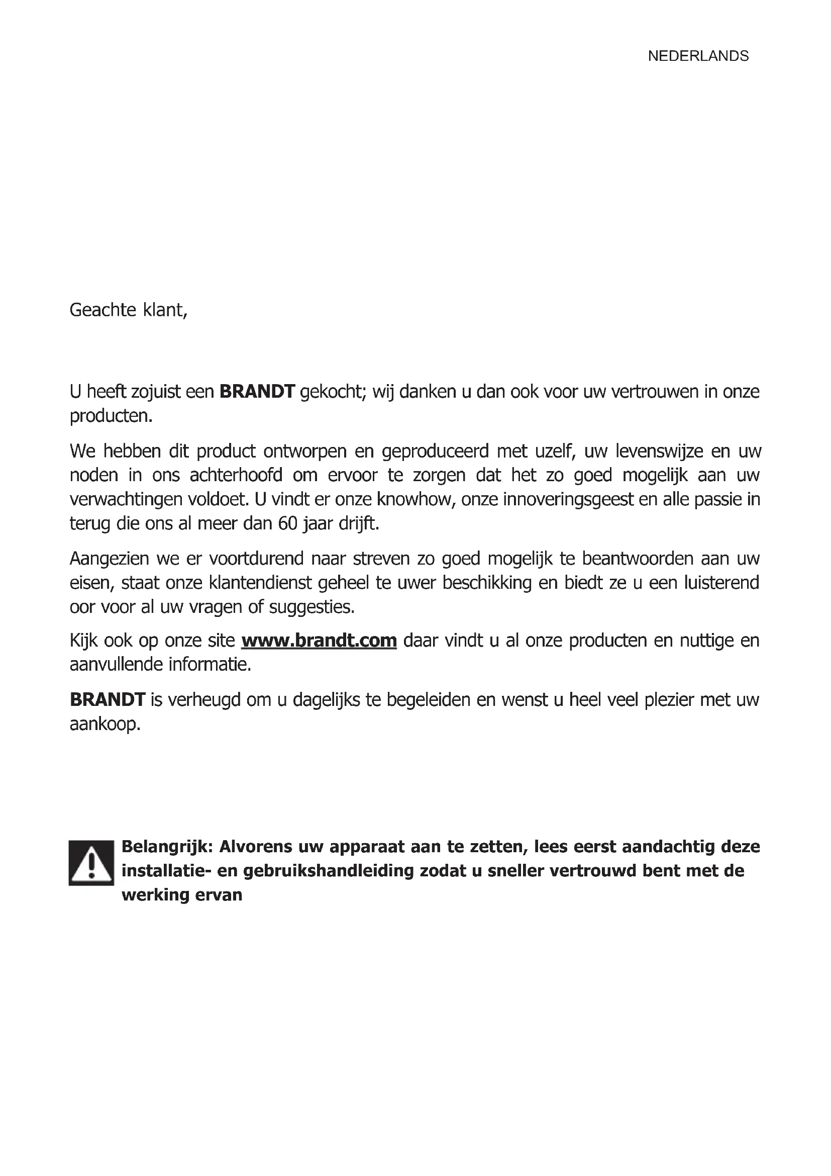 Depending on the modelNEDERLANDS Geachte klant, U heeft zojuist een BRANDT gekocht; wij danken u dan ook voor uw vertrouwen in onze producten. We hebben dit product ontworpen en geproduceerd met uzelf, uw levenswijze en uw noden in ons achterhoofd om ervoor te zorgen dat het zo goed mogelijk aan uw verwachtingen voldoet. U vindt er onze knowhow, onze innoveringsgeest en alle passie in terug die ons al meer dan 60 jaar drijft. Aangezien we er voortdurend naar streven zo goed mogelijk te beantwoorden aan uw eisen, staat onze klantendienst geheel te uwer beschikking en biedt ze u een luisterend oor voor al uw vragen of suggesties. Kijk ook op onze site www.brandt.com daar vindt u al onze producten en nuttige en aanvullende informatie. BRANDT is verheugd om u dagelijks te begeleiden en wenst u heel veel plezier met uw aankoop. Belangrijk: Alvorens uw apparaat aan te zetten, lees eerst aandachtig deze installatie- en gebruikshandleiding zodat u sneller vertrouwd bent met de werking ervanNEDERLANDS Belangrijk : Pak het apparaat onmiddellijk bij ontvangst uit of laat het uitpak- ken. Controleer de algemene staat. Schrijf eventueel voorbe- houd op de leveringsbon waar- van u een exemplaar behoudt. Zet uw apparaat pas aan nadat u deze installatiehandleiding aan- dachtig hebt gelezen, zodat u sneller vertrouwd raakt met de werking ervan. Bewaar deze gebruiksaanwijzing in de nabijheid van het apparaat. Indien het apparaat aan een ander persoon wordt verkocht of gegeven, dient u de gebruik- saanwijzing hierbij niet te verge- ten. Wij vragen u kennis te nemen van de aanwijzingen alvorens het apparaat te installe- ren en te gebruiken. Zij zijn voor uw veiligheid en die van anderen opgesteld. — Dit apparaat is bestemd voor huishoudelijk gebruik. Deze oven is uitsluitend ontworpen voor het bakken van voedingsmiddelen. Deze oven bevat geen enkel bes- tanddeel op basis van asbest. — Het apparaat is bestemd voor normaal huishoudelijk gebruik. Niet gebruiken voor commerciële of industriële doelen of andere doeleinden dan waarvoor het is ontworpen. — De technische gegevens van het apparaat niet wijzigen of proberen te wijzigen. Dit kan gevaarlijk zijn. — Plaats nooit aluminiumfolie rechtstreeks in contact met de ovenbodem omdat de geaccu- muleerde warmte het email kan beschadigen. — Plaats op de open ovendeur geen zware voorwerpen en zorg ervoor dat een kind niet op de deur kan klauteren of erop gaat zitten — Gebruik uw oven niet als voor- raadkast of om enige elementen na gebruik op te bergen. — Na gebruik van de oven, controleert u of alle bedieningen uit staan. — Zet de oven altijd uit voordat u de binnenzijde van de oven gaat reinigen. — Laat het apparaat eerst afkoe- len voordat u de ruit losclipt. Dit apparaat mag worden gebruikt door kinderen vanaf 8 jaar, en door personen met lichamelijke, sensorische of geestelijke beperkingen of door personen zonder ervaring en kennis, als ze onder toezicht staan of vooraf instructies gekre- gen hebben over hoe ze het apparaat veilig moeten gebrui- ken, en begrepen hebben aan welke risico's ze zich blootstel- len. Kinderen mogen niet met het apparaat spelen. De reiniging en het onderhoud mogen alleen onder toezicht aan kinderen overgelaten worden. — Laat kinderen nooit onbe- waakt, om te vermijden dat ze met het apparaat zouden spelen. WAARSCHUWING: het apparaat en de bereikbare onderdelen BELANGRIJKE VEILIGHEIDSINSTRUCTIES - LEES ZE AANDACHTIG EN BEWAAR ZE VOOR TOEKOMSTIG GEBRUIK. U kunt deze handleiding downloaden op de website van het merk. VEILIGHEIDSINSTRUCTIESNEDERLANDS ervan worden warm tijdens het gebruik. Zorg ervoor dat u de verwarmingselementen in de oven niet aanraakt. Het apparaat moet buiten het bereik van kin- deren jonger dan 8 jaar worden gehouden, tenzij ze voortdurend in het oog worden gehouden. — Dit apparaat is ontworpen voor gebruik met gesloten deur. — Verwijder alle accessoires en grote spatten, voordat u de pyrolysereiniging van uw oven start. — In de reinigingsmodus kunnen de oppervlakken warmer worden dan tijdens het normale gebruik. Het is raadzaam om kinderen weg te houden. — Gebruik geen stoomreiniger. — Voordat u de achterwand ver- wijdert moet het apparaat van het elektriciteitsnet worden afgekoppeld. Na het reinigen moet de achterwand weer wor- den geïnstalleerd volgens de ins- tructies. — Gebruik geen schurende reini- gingsproducten of harde metalen krabbers om de glazen ovendeur te reinigen. Dit kan het opperv- lak van het glas beschadigen en doen barsten. WAARSCHUWING: verzeker u ervan dat het apparaat van het elektriciteitsnet is afge- koppeld voordat u de lamp ver- vangt, om elk elektrocutiegevaar te vermijden. Wacht tot het apparaat afgekoeld is. Gebruik een rubberen handschoen om het losschroeven van het vens- terkapje en het lampje te vereenvoudigen. Het stopcontact moet na de ins- tallatie goed bereikbaar zijn. Het apparaat moet van het elektrici- teitsnet kunnen worden afgekop- peld, door middel van een stek- ker in het stopcontact of door een schakelaar te installeren op de vaste voedingsleidingen, vol- gens de installatieregels. Indien de voedingskabel is beschadigd, moet deze door de fabrikant, de klantenservice of een ander gekwalificeerd per- soon veiligheidshalve worden vervangen. — Dit apparaat kan zowel onder het werkblad als in een inbouw- kast worden geïnstalleerd, zoals te zien is op het installatie- schema. — Centreer de oven in het meu- bel en bewaar daarbij een afs- tand van minstens 10 mm tot het meubel ernaast. Het materiaal van het inbouwmeubel moet warmtebestendig zijn (of bekleed zijn met dergelijk mate- riaal). Bevestig de oven voor meer stabiliteit in het meubel met behulp van 2 schroeven door de daartoe voorziene gaten. Het apparaat mag niet achter een decoratieve deur worden geplaatst, om oververhitting te voorkomen. VEILIGHEIDSINSTRUCTIESBedieningspaneel Lamp Deur HandgreepInstelling van tijd en duurInstelling temperatuurToets -Toets +Deze oven heeft 6 niveaus