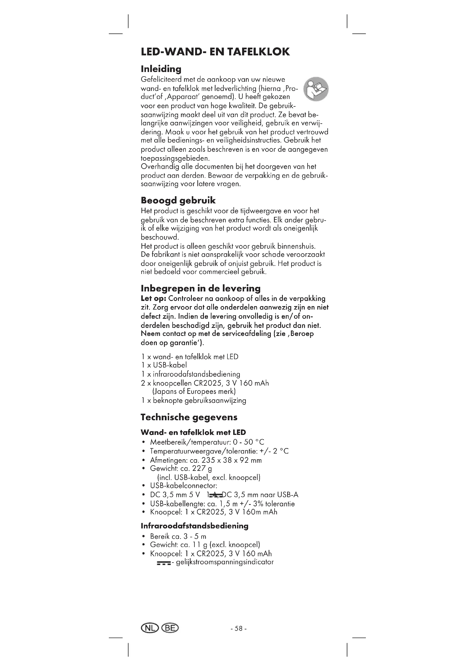 Inleiding Gefeliciteerd met de aankoop van uw nieuwe wand- en tafelklok met ledverlichting (hierna ‚Pro- duct‘of ‚Apparaat‘ genoemd). U heeft gekozen voor een product van hoge kwaliteit. De gebruik- saanwijzing maakt deel uit van dit product. Ze bevat be- langrijke aanwijzingen voor veiligheid, gebruik en verwij- dering. Maak u voor het gebruik van het product vertrouwd met alle bedienings- en veiligheidsinstructies. Gebruik het product alleen zoals beschreven is en voor de aangegeven toepassingsgebieden. Overhandig alle documenten bij het doorgeven van het product aan derden. Bewaar de verpakking en de gebruik- saanwijzing voor latere vragen. Beoogd gebruik Het product is geschikt voor de tijdweergave en voor het gebruik van de beschreven extra functies. Elk ander gebru- ik of elke wijziging van het product wordt als oneigenlijk beschouwd. Het product is alleen geschikt voor gebruik binnenshuis. De fabrikant is niet aansprakelijk voor schade veroorzaakt door oneigenlijk gebruik of onjuist gebruik. Het product is niet bedoeld voor commercieel gebruik. Inbegrepen in de levering Let op: Controleer na aankoop of alles in de verpakking zit Zorg ervoor dat alle onderdelen aanwezig zijn en niet defect zijn Indien de levering onvolledig is en/of on- derdelen beschadigd zijn, gebruik het product dan niet Neem contact op met de serviceafdeling (zie ‚Beroep doen op garantie‘) 1 x wand- en tafelklok met LED 1 x USB-kabel 1 x infraroodafstandsbediening 2 x knoopcellen CR2025, 3 V 160 mAh (Japans of Europees merk) 1 x beknopte gebruiksaanwijzing Technische gegevens Wand- en tafelklok met LED