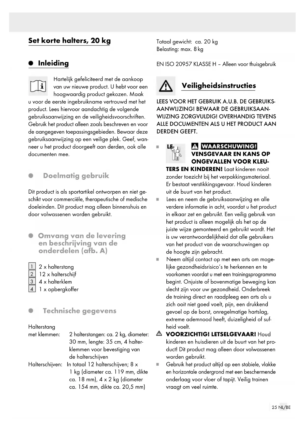 1 x opbergkoffer Technische gegevens Halterstang met klemmen: 2 halterstangen: ca. 2 kg, diameter: 30 mm, lengte: 35 cm, 4 halter- klemmen voor bevestiging van de halterschijven Halterschijven: In totaal 12 halterschijven; 8 x 1 kg (diameter ca. 119 mm, dikte ca. 18 mm), 4 x 2 kg (diameter ca. 154 mm, dikte ca. 20,5 mm) Totaal gewicht: ca. 20 kg Belasting: max. 8 kg EN ISO 20957 KLASSE H – Alleen voor thuisgebruik Veiligheidsinstructies LEES VOOR HET GEBRUIK A.U.B. DE GEBRUIKS-