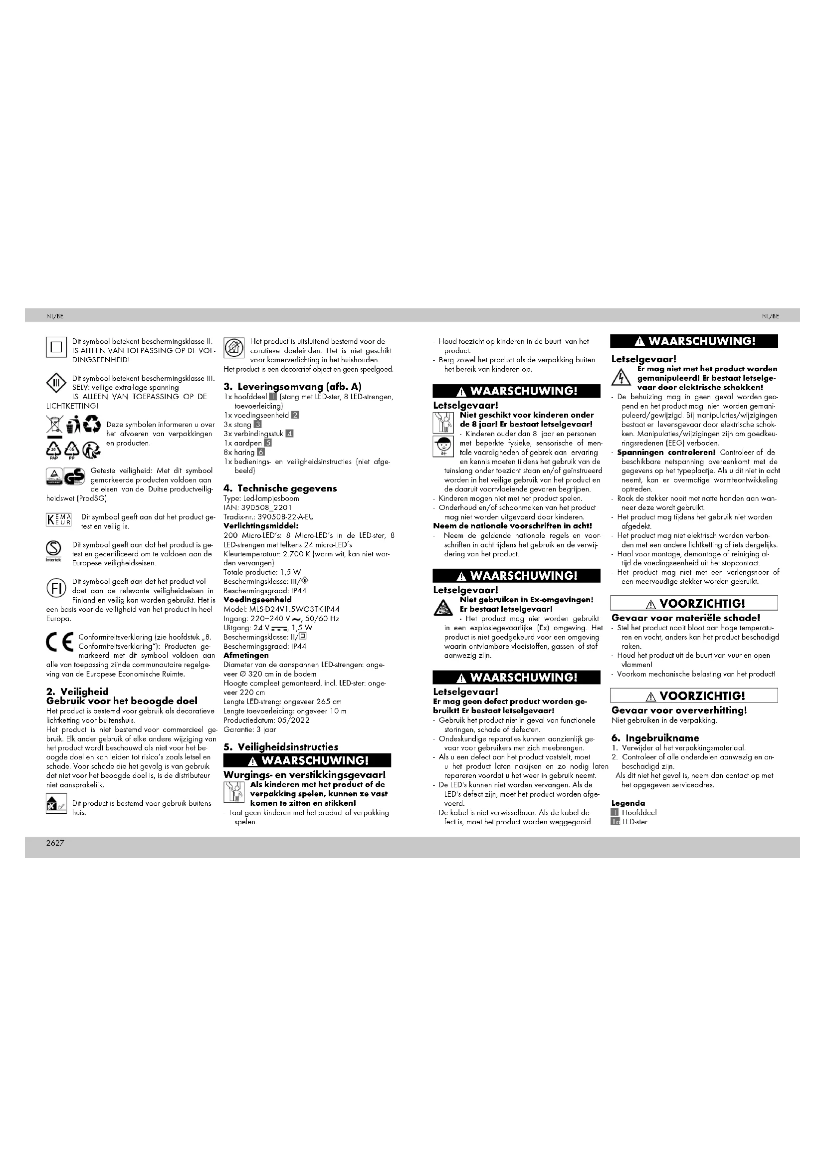 Type: Led-lampjesboom IAN: 390508_2201 Tradix-nr.: 390508-22-A-EU Verlichtingsmiddel: 200 Micro-LED’s: 8 Micro-LED’s in de LED-ster, 8 LED-strengen met telkens 24 micro-LED’s Kleurtemperatuur: 2.700 K (warm wit, kan niet wor- den vervangen) Totale productie: 1,5 W Beschermingsklasse: III/ Beschermingsgraad: IP44 Voedingseenheid Model: MLS-D24V1.5WG3TK-IP44 Ingang: 220−240 V , 50/60 Hz Uitgang: 24 V , 1,5 W Beschermingsklasse: II/ Beschermingsgraad: IP44 Afmetingen Diameter van de aanspannen LED-strengen: onge- veer Ø 320 cm in de bodem Hoogte compleet gemonteerd, incl. LED-ster: onge- veer 220 cm Lengte LED-streng: ongeveer 265 cm Lengte toevoerleiding: ongeveer 10 m Productiedatum: 05/2022 Garantie: 3 jaar