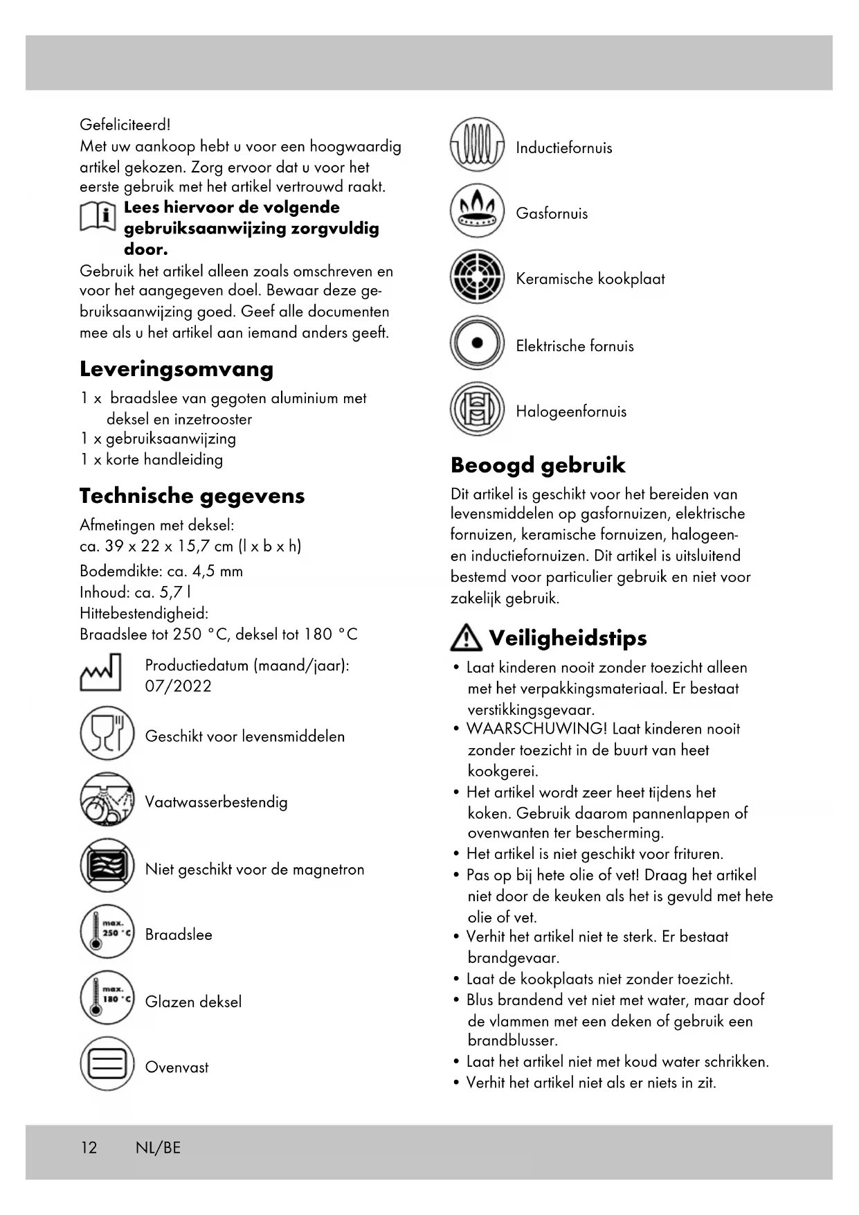 - BELANGRIJK! Reinig nooit met agressieve reinigingsmiddelen. Afvalverwerking Voer het artikel en verpakkingsmaterialen in overeenstemming met actuele lokale voor- schriften af. Verpakkingsmaterialen, zoals bv. foliezakjes, horen niet thuis in kinderhanden. Berg het verpakkingsmateriaal buiten het bereik van kinderen op. Voer de producten en verpakkingen op milieuvriendelijke wijze af. De recyclingcode dient om verschillende materialen te kenmerken ten behoeve van hergebruik via het recyclingproces. De code bestaat uit het recyclingsymbool, dat het recyclingproces weerspiegelt, en een getal dat het materiaal identificeert. Opmerkingen over garantie en serviceafhandeling Het artikel werd met de grootste zorgvuldigheid en onder permanent toezicht geproduceerd. De firma DELTA-SPORT HANDELSKONTOR GmbH verleent particuliere eindklanten op dit artikel drie jaar garantie, te rekenen vanaf de datum van aankoop (garantietermijn) en dit op grond van de volgende bepalingen. De garantie geldt alleen voor materiaal- en verwerkingsfouten.14 De garantie is niet van toepassing op onderde- len die aan een normale slijtage onderhevig zijn en daarom als niet-slijtvaste onderdelen te beschouwen zijn (bv. batterijen) en evenmin op breekbare onderdelen, bv. schakelaars, accu’s of onderdelen die van glas gemaakt zijn. Uit de garantie voortvloeiende claims zijn uitge- sloten als het artikel onvakkundig, verkeerd of niet in het kader van de voorziene bepaling of in het kader van het voorziene gebruiksdoeleinde gebruikt werd of indien richtlijnen in de gebruiks- aanwijzing niet in acht genomen werden, tenzij de eindklant aantoont dat er sprake is van een materiaal- of verwerkingsfout die niet op één van de hoger vermelde omstandigheden gebaseerd is. Uit de garantie voortvloeiende claims kunnen alleen tijdens de garantieperiode op vertoon van de originele kassabon ingediend wor- den. Gelieve daarom de originele kassabon te bewaren. De garantieperiode wordt door eventuele reparaties op grond van de garantie, wettelijke waarborg of coulance niet verlengd. Dit geldt ook voor vervangen en gerepareerde onderdelen. Gelieve u bij klachten in eerste instantie tot de hieronder vermelde servicehotline te richten of met ons per e-mail contact op te nemen. Is er sprake van een garantiegeval, dan wordt het ar- tikel door ons – naar onze keuze – voor u gratis gerepareerd, wordt het vervangen of wordt de aankoopsom terugbetaald. Verdere rechten op grond van de garantie bestaan niet. Uw wettelijke rechten, in het bijzonder rechten op garantie tegenover de betreffende verkoper, worden door deze garantie niet beperkt. IAN: 390017_2201 Service België Tel.: 0800 12089 E-Mail: deltasport@lidl.be Service Nederland Tel.: 08000249630 E-Mail: deltasport@lidl.nl NL/BE15 Gratulujemy! Decydując się na ten produkt, otrzymują Pań- stwo towar wysokiej jakości. Należy zapoznać się z produktem przed jego pierwszym użyciem. Należy uważnie przeczytać następującą instrukcję użytkowa- nia. Produkt ten należy użytkować wyłącznie w opisany sposób oraz zgodnie ze wskazanym przeznaczeniem. Niniejszą instrukcję użytko- wania należy przechowywać w bezpiecznym miejscu. Przekazując produkt innej osobie, należy upewnić się, że otrzyma ona także całą dokumentację dotyczącą produktu. Zakres dostawy 1 x brytfanna z odlewu aluminiowego z pokrywą i wkładem kratkowym 1 x instrukcja użytkowania 1 x skrócona instrukcja Dane techniczne Wymiary z pokrywą: ok. 39 x 22 x 15,7 cm (dł. x szer. x wys.) Grubość dna: ok. 4,5 mm Pojemność: ok. 5,7 l Odporność na wysoką temperaturę: Brytfanna do 250°C, pokrywa do 180°C Data produkcji (miesiąc/rok): 07/2022 Produkt bezpieczny do przechowywania żywności Przystosowany do mycia w zmywarce Nieprzystosowany do podgrzewania w kuchence mikrofalowej Brytfanna Szklana pokrywa Nadaje się do zastosowania w piekarniku Płyta indukcyjna Kuchenka gazowa Płyta grzewcza z ceramiki szklanej Kuchenka elektryczna Kuchenka halogenowa Użytkowanie zgodne z przeznaczeniem Ten produkt nadaje się do przyrządzania potraw na kuchence gazowej, elektrycznej, płycie z ceramiki szklanej, a także na kuchence halogenowej i płycie indukcyjnej. Produkt jest przeznaczony wyłącznie do prywatnego użytku, a nie do użytku komercyjnego. Wskazówki bezpieczeństwa