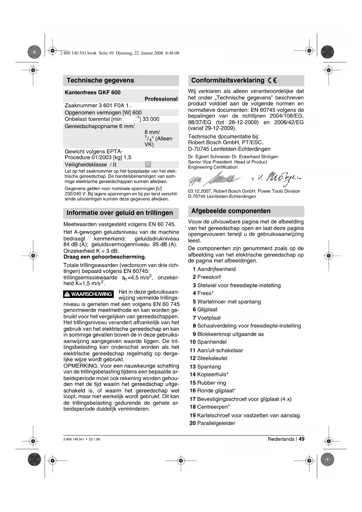 " (Alleen VK) Gewicht volgens EPTA- Procedure 01/2003 [kg] 1,5 Veiligheidsklasse / II Let op het zaaknummer op het typeplaatje van het elek- trische gereedschap. De handelsbenamingen van som- mige elektrische gereedschappen kunnen afwijken. Gegevens gelden voor nominale spanningen [U] 230/240 V. Bij lagere spanningen en bij per land verschil- lende uitvoeringen kunnen deze gegevens afwijken. Informatie over geluid en trillingen WAARSCHUWING Conformiteitsverklaring Afgebeelde componenten 2 609 140 541.book Seite 49 Dienstag, 22. Januar 2008 8:46 082 609 140 541 • 22.1.08 50 | Nederlands 21 Vleugelschroef voor parallelgeleider 22 Geleidingshulp 23 Vleugelschroef voor horizontaal instellen van geleidingshulp 24 Vleugelschroef voor vastzetten van horizontale instelling 25 Afdekking freeskorf* 26 Haakse freeskorf* 27 Vleugelschroef voor hoekverstelling 28 Schaalverdeling voor freeshoekverstelling 29 Handgreep* 30 Afzuigring* 31 Afzuigadapter* 32 Glijplaat met handgreep en afzuigadapter*