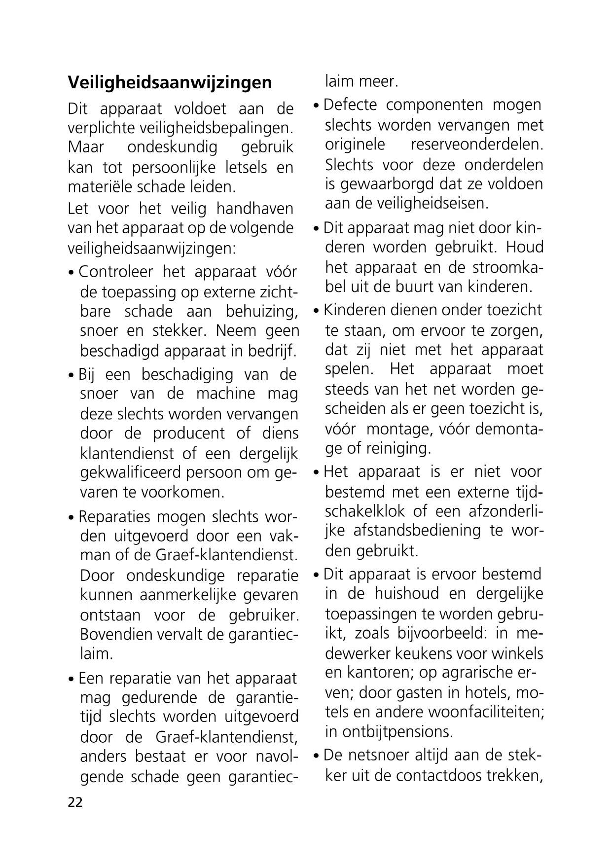 - Reparaties mogen slechts wor- den uitgevoerd door een vak- man of de Graef-klantendienst. Door ondeskundige reparatie kunnen aanmerkelijke gevaren ontstaan voor de gebruiker. Bovendien vervalt de garantiec- laim.