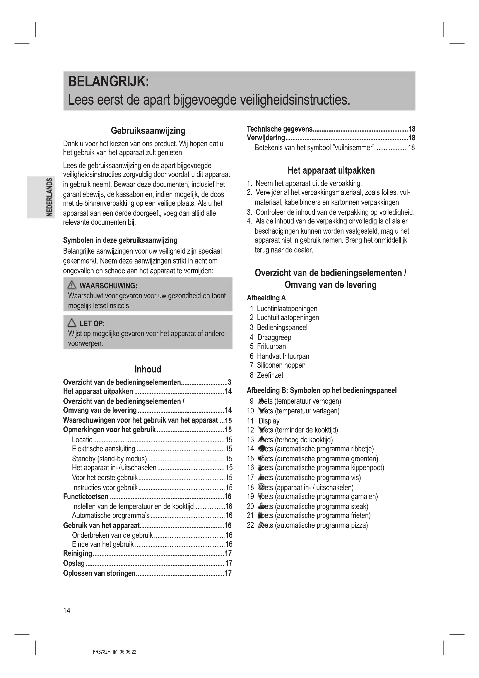 beschadigingen kunnen worden vastgesteld, mag u het apparaat niet in gebruik nemen. Breng het onmiddellijk terug naar de dealer. Overzicht van de bedieningselementen / Omvang van de levering Afbeelding A 1 Luchtinlaatopeningen 2 Luchtuitlaatopeningen 3 Bedieningspaneel 4 Draaggreep 5 Frituurpan 6 Handvat frituurpan 7 Siliconen noppen 8 Zeenzet Afbeelding B: Symbolen op het bedieningspaneel 9 toets (temperatuur verhogen) 10 toets (temperatuur verlagen) 11 Display 12 toets (terminder de kooktijd) 13 toets (terhoog de kooktijd) 14 toets (automatische programma ribbetje) 15 toets (automatische programma groenten) 16 toets (automatische programma kippenpoot) 17 toets (automatische programma vis) 18 toets (apparaat in- / uitschakelen) 19 toets (automatische programma garnalen) 20 toets (automatische programma steak) 21 toets (automatische programma frieten) 22 toets (automatische programma pizza)FR3782H_IM 06.05.22