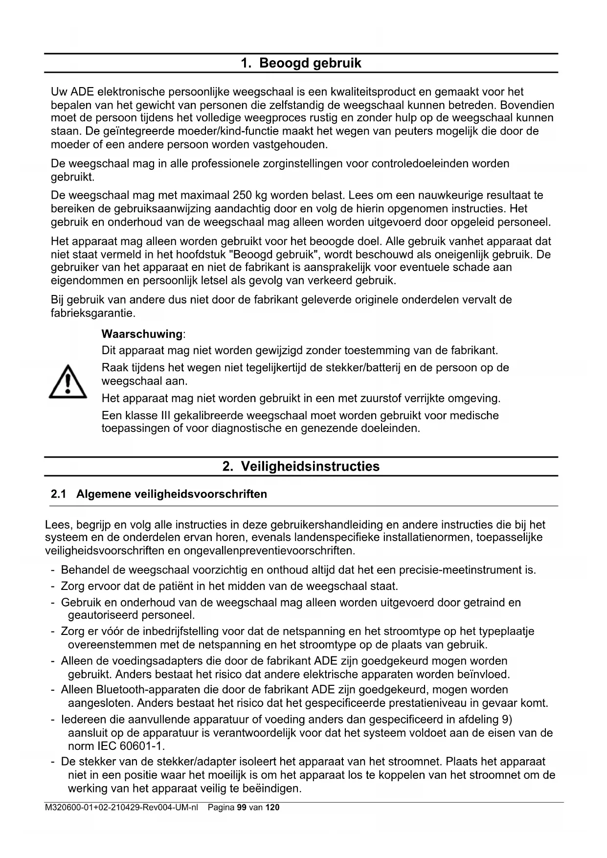 Lees, begrijp en volg alle instructies in deze gebruikershandleiding en andere instructies die bij het systeem en de onderdelen ervan horen, evenals landenspecifieke installatienormen, toepasselijke veiligheidsvoorschriften en ongevallenpreventievoorschriften. - Behandel de weegschaal voorzichtig en onthoud altijd dat het een precisie-meetinstrument is. - Zorg ervoor dat de patiënt in het midden van de weegschaal staat. - Gebruik en onderhoud van de weegschaal mag alleen worden uitgevoerd door getraind en geautoriseerd personeel. - Zorg er vóór de inbedrijfstelling voor dat de netspanning en het stroomtype op het typeplaatje overeenstemmen met de netspanning en het stroomtype op de plaats van gebruik. - Alleen de voedingsadapters die door de fabrikant ADE zijn goedgekeurd mogen worden gebruikt. Anders bestaat het risico dat andere elektrische apparaten worden beïnvloed. - Alleen Bluetooth-apparaten die door de fabrikant ADE zijn goedgekeurd, mogen worden aangesloten. Anders bestaat het risico dat het gespecificeerde prestatieniveau in gevaar komt. - Iedereen die aanvullende apparatuur of voeding anders dan gespecificeerd in afdeling 9) aansluit op de apparatuur is verantwoordelijk voor dat het systeem voldoet aan de eisen van de norm IEC 60601-1. - De stekker van de stekker/adapter isoleert het apparaat van het stroomnet. Plaats het apparaat niet in een positie waar het moeilijk is om het apparaat los te koppelen van het stroomnet om de werking van het apparaat veilig te beëindigen.Pagina 100 van 120 M320600-01+02-210429-Rev004-UM-nl - Leg de aansluitkabel tussen weegschaal en netaansluiting zodanig dat deze geen struikelgevaar veroorzaakt. - Leg de verbindingskabel tussen weegschaal en netaansluiting zodanig dat deze geen verstikkingsgevaar veroorzaakt. - Schuif de weegschaal nooit heen en weer op de standplaats, omdat dit de weegcellen kan beschadigen. - Gebruik het apparaat alleen binnen de toegestane omgevingscondities. - Stel de weegschaal niet bloot aan hoge temperaturen, of dit nu te wijten is aan aangrenzende apparaten of zonnestralen. Het LCD-display zou daaronder kunnen lijden. - Gebruik de weegschaal bij constante omgevingstemperaturen en vermijd het gebruik in tocht, anders kunnen de meetresultaten worden beïnvloed. - Na opslag onder extreme omstandigheden minimaal 30 min. nodig totdat de weegschaal is geacclimatiseerd en gereed is voor gebruik. - Plaats de weegschaal zo mogelijk uit de buurt van andere apparaten of bronnen die elektromagnetische of andere storingen genereren, omdat deze de meetresultaten kunnen beïnvloeden. - Gebruik alleen goedgekeurde accessoires en randapparatuur. - Koppel de voedingsadapter los van het lichtnet voordat u het apparaat schoonmaakt. - Dompel het apparaat niet onder in water of andere vloeistoffen. - Als de weegschaal lange tijd niet wordt gebruikt, moet deze worden schoongemaakt en bewaard in een beschermende folie. De toevoeging van een droogmiddel is wenselijk. - Verwijder de batterijen als u de weegschaal gedurende langere tijd niet gebruikt. - Als u problemen hebt met dit apparaat, zoals het instellen, onderhouden of gebruiken, neem dan contact op met de geautoriseerde klantenservice. Open of repareer het apparaat niet zelf. - Meld geautoriseerde klantenservice bij onverwachte bediening of gebeurtenissen. Gebruik de weegschaal NIET: - als de voedingsadapter is beschadigd; - als de voedingsadapter niet werkt; - als het batterijvak onnatuurlijk uitpuilt; - na lange bewaring in een vochtige omgeving. Neem in deze gevallen contact op met de geautoriseerde klantendienst.M320600-01+02-210429-Rev004-UM-nl Pagina 101 van 120