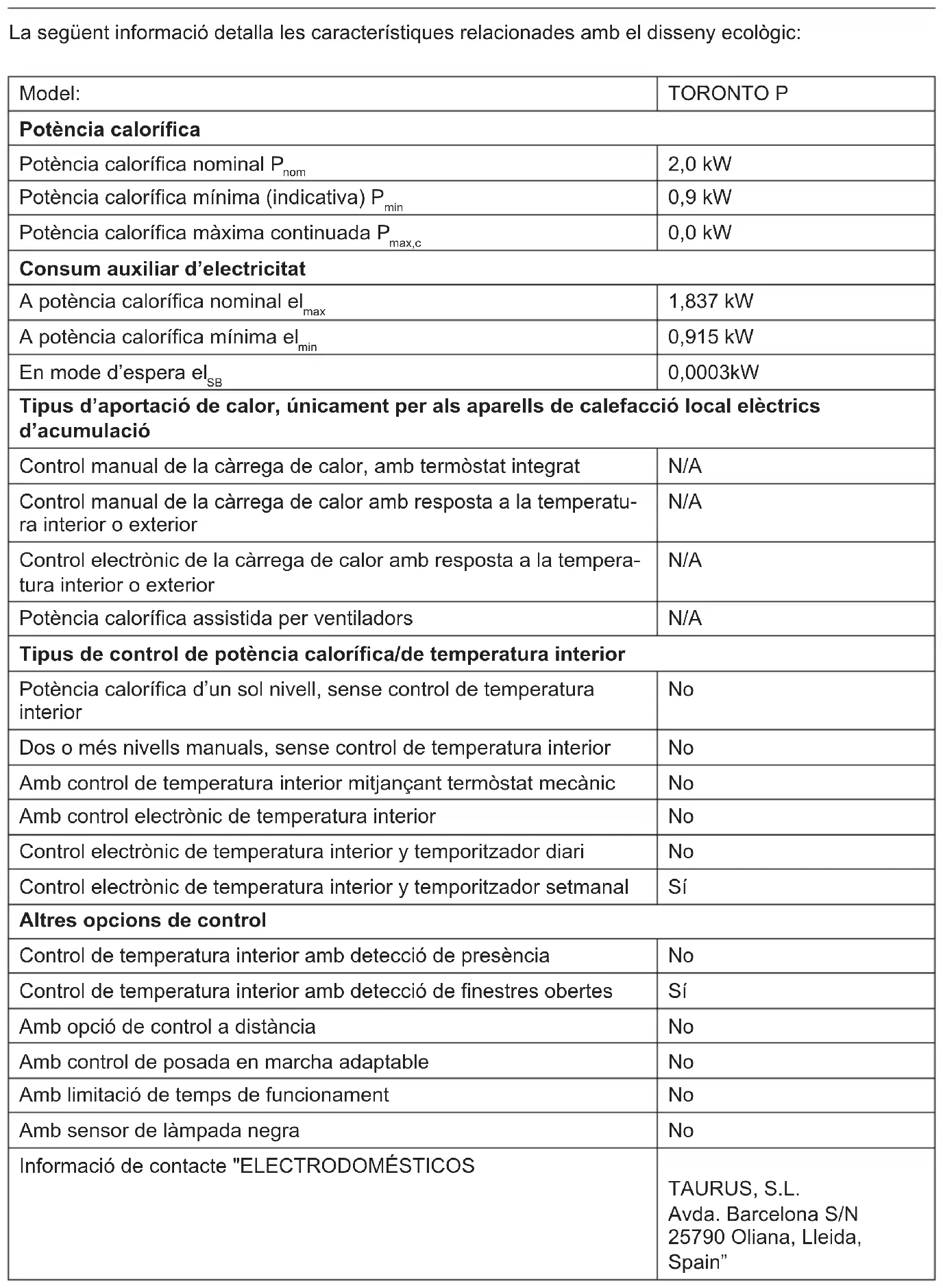 0,0003kW Type warmte-input, uitsluitend voor elektrische warmteopslagtoestellen Handmatige sturing van de warmteopslag, met geïntegreerde thermos- taat N/A Handmatige sturing van de warmteopslag, met kameren/of buitentem- peratuurfeedback N/A Elektronische sturing van de warmteopslag, met kameren/of buiten- temperatuurfeedback N/A Door een ventilator bijgestane warmteafgifte N/A Type regeling verwarmingsvermogen/inwendige temperatuur Unieke stand verwarmingsvermogen, geen regeling inwendige tempe- ratuur Nee Twee of meer met de hand instelbare standen, geen regeling inwendi- ge temperatuur Nee Met regeling inwendige temperatuur via een mechanische thermostaat Nee Met elektronische regeling van inwendige temperatuur Nee Elektronische regeling inwendige temperatuur en dagelijkse timer Nee Elektronische regeling inwendige temperatuur en wekelijkse timer Ja Andere besturingssystemen Regeling inwendige temperatuur met aanwezigheidsdetectie Nee Regeling inwendige temperatuur met detectie open ramen Ja Met optionele afstandsbediening Nee Met instelbare inschakeling Nee Met beperking van werkingsduur Nee Met zwartlichtlamp sensor Nee Contactgegevens "ELECTRODOMÉSTICOS TAURUS, S.L. Avda. Barcelona S/N 25790 Oliana, Lleida, Spain”Polski Kominek elektryczny TORONTO P Szanowny Kliencie, Serdecznie dziękujemy za zdecydowanie się na zakup sprzętu gospodarstwa domowego marki TAURUS ALPATEC. Jego technologia, forma i funkcjonalność, jak również fakt, że spełnia on wszelkie normy jakości, dostarczy Państwu pełnej satysfakcji przez długi czas. Przeczytać uważnie instrukcję przed uruchomieniem urządzenia i zachować ją w celu późniejszych konsultacji. Niedostosowanie się i nieprzestrzeganie niniejszych instrukcji może doprowadzić do wypadku.