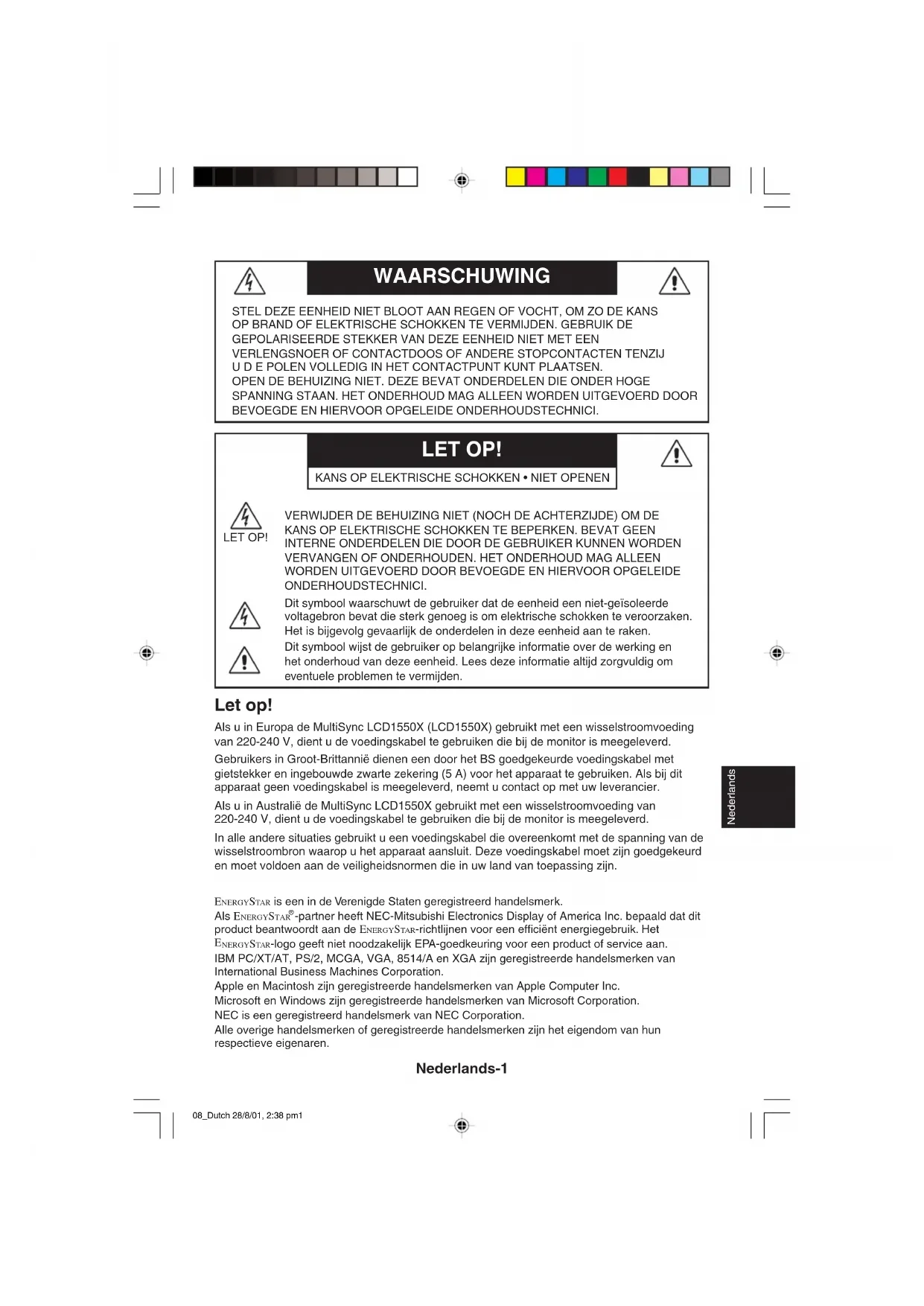 Let op! Als u in Europa de MultiSync LCD1550X (LCD1550X) gebruikt met een wisselstroomvoeding van 220-240 V, dient u de voedingskabel te gebruiken die bij de monitor is meegeleverd. Gebruikers in Groot-Brittannië dienen een door het BS goedgekeurde voedingskabel met gietstekker en ingebouwde zwarte zekering (5 A) voor het apparaat te gebruiken. Als bij dit apparaat geen voedingskabel is meegeleverd, neemt u contact op met uw leverancier. Als u in Australië de MultiSync LCD1550X gebruikt met een wisselstroomvoeding van 220-240 V, dient u de voedingskabel te gebruiken die bij de monitor is meegeleverd. In alle andere situaties gebruikt u een voedingskabel die overeenkomt met de spanning van de wisselstroombron waarop u het apparaat aansluit. Deze voedingskabel moet zijn goedgekeurd en moet voldoen aan de veiligheidsnormen die in uw land van toepassing zijn. ENERGYSTAR is een in de Verenigde Staten geregistreerd handelsmerk. Als E NERGYSTAR