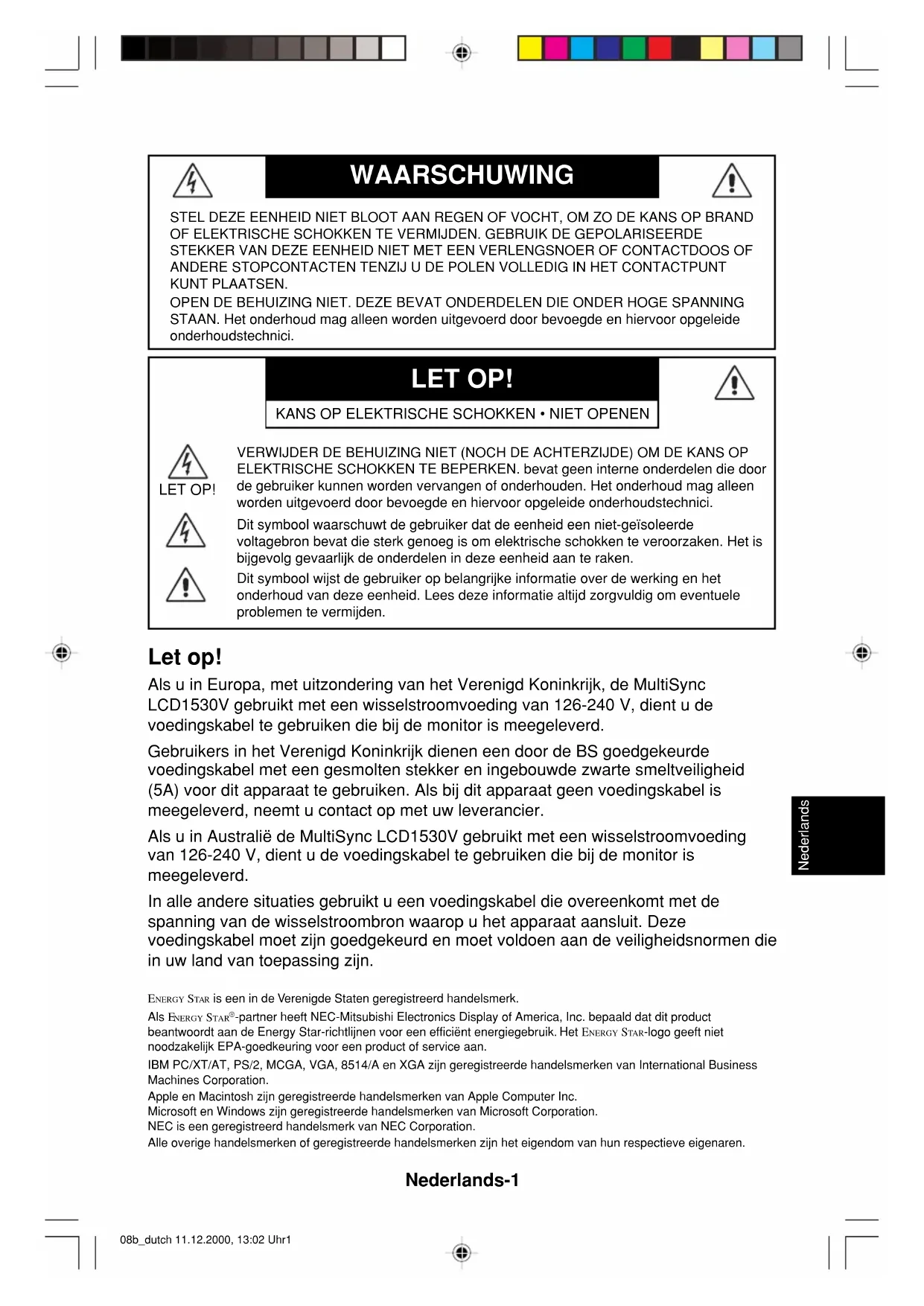 ENERGY STAR is een in de Verenigde Staten geregistreerd handelsmerk. Als ENERGY STAR -partner heeft NEC-Mitsubishi Electronics Display of America, Inc. bepaald dat dit product beantwoordt aan de Energy Star-richtlijnen voor een efficiënt energiegebruik. Het ENERGY STAR-logo geeft niet noodzakelijk EPA-goedkeuring voor een product of service aan.IBM PC/XT/AT, PS/2, MCGA, VGA, 8514/A en XGA zijn geregistreerde handelsmerken van International BusinessMachines Corporation.Apple en Macintosh zijn geregistreerde handelsmerken van Apple Computer Inc.Microsoft en Windows zijn geregistreerde handelsmerken van Microsoft Corporation.NEC is een geregistreerd handelsmerk van NEC Corporation.Alle overige handelsmerken of geregistreerde handelsmerken zijn het eigendom van hun respectieve eigenaren. Let op! Als u in Europa, met uitzondering van het Verenigd Koninkrijk, de MultiSync LCD1530V gebruikt met een wisselstroomvoeding van 126-240 V, dient u de voedingskabel te gebruiken die bij de monitor is meegeleverd. Gebruikers in het Verenigd Koninkrijk dienen een door de BS goedgekeurde voedingskabel met een gesmolten stekker en ingebouwde zwarte smeltveiligheid (5A) voor dit apparaat te gebruiken. Als bij dit apparaat geen voedingskabel is meegeleverd, neemt u contact op met uw leverancier. Als u in Australië de MultiSync LCD1530V gebruikt met een wisselstroomvoeding van 126-240 V, dient u de voedingskabel te gebruiken die bij de monitor is meegeleverd. In alle andere situaties gebruikt u een voedingskabel die overeenkomt met de spanning van de wisselstroombron waarop u het apparaat aansluit. Deze voedingskabel moet zijn goedgekeurd en moet voldoen aan de veiligheidsnormen die in uw land van toepassing zijn. 08b_dutch 11.12.2000, 13:02 Uhr1Nederlands-2 Kennisgeving Kennisgeving van de fabrikant Hierbij verklaren wij dat de kleurenmonitor MultiSync LCD1530V (LA-15R01) in overeenstemming is met 73/23/EEC van de Europese Commissie: - EN 60950 89/336/EEC van de Europese Commissie: - EN 55022 - EN 61000-3-2 - EN 61000-3-3 - EN 55024 en het volgende keurmerk heeft: NEC-Mitsubishi Electric Visual Systems, Corp.