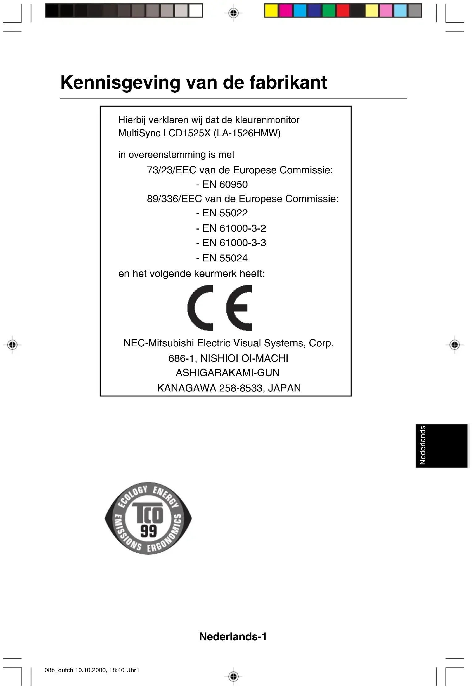 -partner heeft NEC-Mitsubishi Electronics Display of America, Inc. bepaald dat dit product beantwoordt aan de Energy Star-richtlijnen voor een efficiënt energiegebruik. Het ENERGY STA R -logo geeft niet noodzakelijk EPA-goedkeuring voor een product of service aan. IBM PC/XT/AT, PS/2, MCGA, VGA, 8514/A en XGA zijn geregistreerde handelsmerken van International Business Machines Corporation. Apple en Macintosh zijn geregistreerde handelsmerken van Apple Computer Inc. Microsoft en Windows zijn geregistreerde handelsmerken van Microsoft Corporation. NEC is een geregistreerd handelsmerk van NEC Corporation. Alle overige handelsmerken of geregistreerde handelsmerken zijn het eigendom van hun respectieve eigenaren. Veiligheid 08b_dutch 10.10.2000, 18:40 Uhr12Polski-1 Polski Deklaracja wytwórcy Niniejszym oÊwiadczamy, ˝e ten kolorowy monitor MultiSync LCD1525X (LA-1526HMW) spe∏nia Dyrektyw´ Rady 73/23/EEC: - EN 60950 Dyrektywà Rady 89/336/EEC: - EN 55022 - EN 61000-3-2 - EN 61000-3-3 - EN 55024 i jest oznaczony NEC-Mitsubishi Electric Visual Systems, Corp.