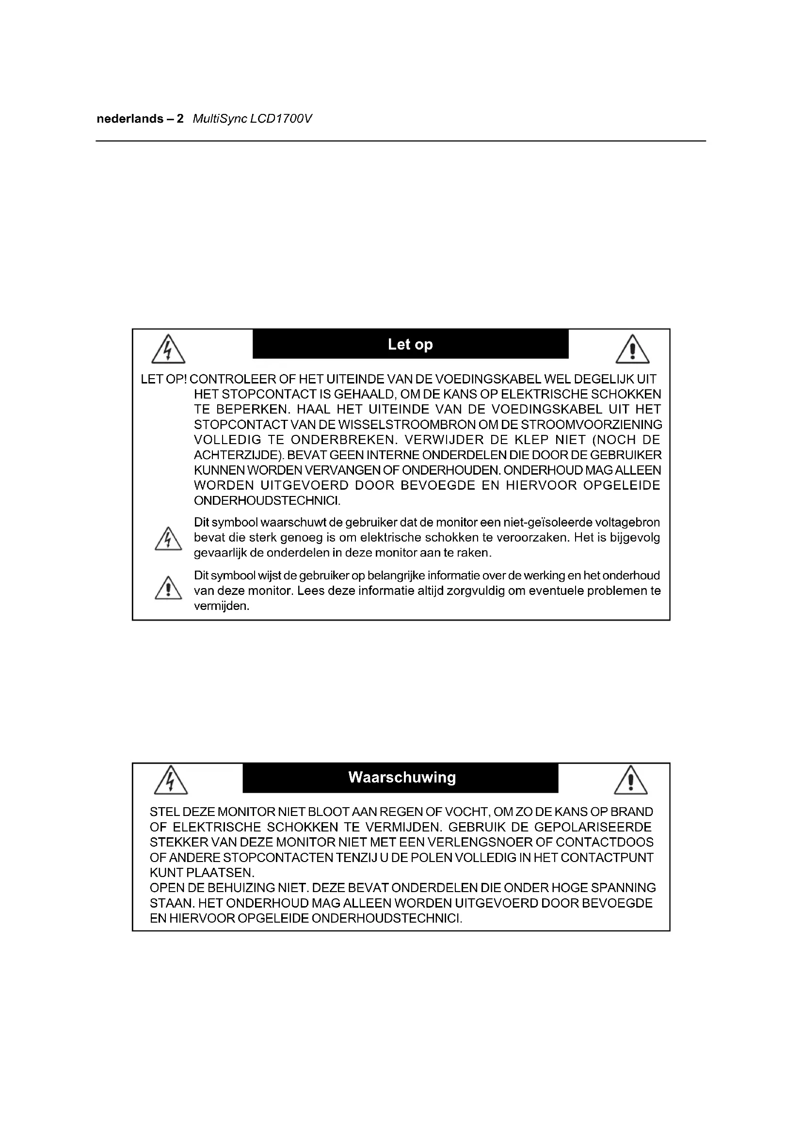 - Ga voorzichtig te werk als u de monitor moet verplaatsen of vervoeren. Bewaar de verpakking voor een eventueel transport. VOOR EEN OPTIMAAL RESULTAAT BIJ DE INSTALLATIE EN HET GEBRUIK VAN DE MULTISYNC LCD-KLEURENMONITOR IS HET BELANGRIJK DAT U DE ONDERSTAANDE INSTRUCTIES VOLGT: LET OP! Gebruikershandleiding nederlands – 9nederlands – 10 MultiSync LCD1700V Aanbevolen gebruik – vervolg