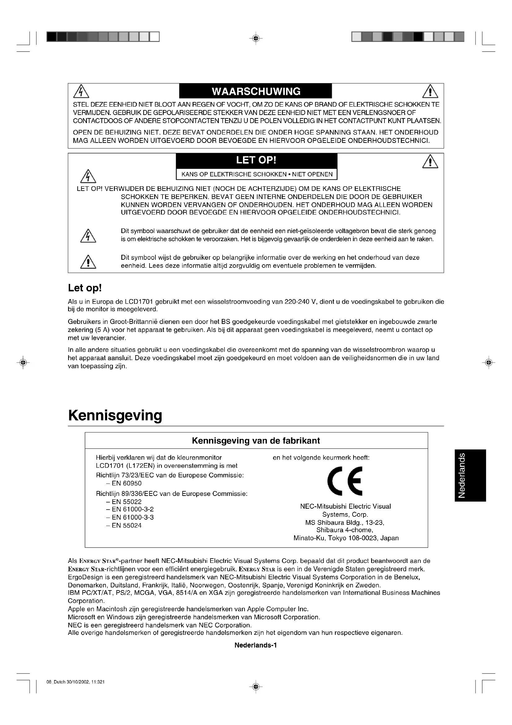 -partner heeft NEC-Mitsubishi Electric Visual Systems Corp. bepaald dat dit product beantwoordt aan de ENERGY STA R-richtlijnen voor een efficiënt energiegebruik. ENERGY STAR is een in de Verenigde Staten geregistreerd merk. ErgoDesign is een geregistreerd handelsmerk van NEC-Mitsubishi Electric Visual Systems Corporation in de Benelux, Denemarken, Duitsland, Frankrijk, Italië, Noorwegen, Oostenrijk, Spanje, Verenigd Koninkrijk en Zweden. IBM PC/XT/AT, PS/2, MCGA, VGA, 8514/A en XGA zijn geregistreerde handelsmerken van International Business Machines Corporation. Apple en Macintosh zijn geregistreerde handelsmerken van Apple Computer Inc. Microsoft en Windows zijn geregistreerde handelsmerken van Microsoft Corporation. NEC is een geregistreerd handelsmerk van NEC Corporation. Alle overige handelsmerken of geregistreerde handelsmerken zijn het eigendom van hun respectieve eigenaren. Hierbij verklaren wij dat de kleurenmonitor LCD1701 (L172EN) in overeenstemming is met Richtlijn 73/23/EEC van de Europese Commissie: – EN 60950 Richtlijn 89/336/EEC van de Europese Commissie: – EN 55022 – EN 61000-3-2 – EN 61000-3-3 – EN 55024 en het volgende keurmerk heeft: NEC-Mitsubishi Electric Visual Systems, Corp. MS Shibaura Bldg., 13-23, Shibaura 4-chome, Minato-Ku, Tokyo 108-0023, Japan Let op! Als u in Europa de LCD1701 gebruikt met een wisselstroomvoeding van 220-240 V, dient u de voedingskabel te gebruiken die bij de monitor is meegeleverd. Gebruikers in Groot-Brittannië dienen een door het BS goedgekeurde voedingskabel met gietstekker en ingebouwde zwarte zekering (5 A) voor het apparaat te gebruiken. Als bij dit apparaat geen voedingskabel is meegeleverd, neemt u contact op met uw leverancier. In alle andere situaties gebruikt u een voedingskabel die overeenkomt met de spanning van de wisselstroombron waarop u het apparaat aansluit. Deze voedingskabel moet zijn goedgekeurd en moet voldoen aan de veiligheidsnormen die in uw land van toepassing zijn. STEL DEZE EENHEID NIET BLOOT AAN REGEN OF VOCHT, OM ZO DE KANS OP BRAND OF ELEKTRISCHE SCHOKKEN TE VERMIJDEN. GEBRUIK DE GEPOLARISEERDE STEKKER VAN DEZE EENHEID NIET MET EEN VERLENGSNOER OF CONTACTDOOS OF ANDERE STOPCONTACTEN TENZIJ U DE POLEN VOLLEDIG IN HET CONTACTPUNT KUNT PLAATSEN. OPEN DE BEHUIZING NIET. DEZE BEVAT ONDERDELEN DIE ONDER HOGE SPANNING STAAN. HET ONDERHOUD MAG ALLEEN WORDEN UITGEVOERD DOOR BEVOEGDE EN HIERVOOR OPGELEIDE ONDERHOUDSTECHNICI. WAARSCHUWING LET OP! LET OP! VERWIJDER DE BEHUIZING NIET (NOCH DE ACHTERZIJDE) OM DE KANS OP ELEKTRISCHE SCHOKKEN TE BEPERKEN. BEVAT GEEN INTERNE ONDERDELEN DIE DOOR DE GEBRUIKER KUNNEN WORDEN VERVANGEN OF ONDERHOUDEN. HET ONDERHOUD MAG ALLEEN WORDEN UITGEVOERD DOOR BEVOEGDE EN HIERVOOR OPGELEIDE ONDERHOUDSTECHNICI. Dit symbool waarschuwt de gebruiker dat de eenheid een niet-geïsoleerde voltagebron bevat die sterk genoeg is om elektrische schokken te veroorzaken. Het is bijgevolg gevaarlijk de onderdelen in deze eenheid aan te raken. Dit symbool wijst de gebruiker op belangrijke informatie over de werking en het onderhoud van deze eenheid. Lees deze informatie altijd zorgvuldig om eventuele problemen te vermijden.