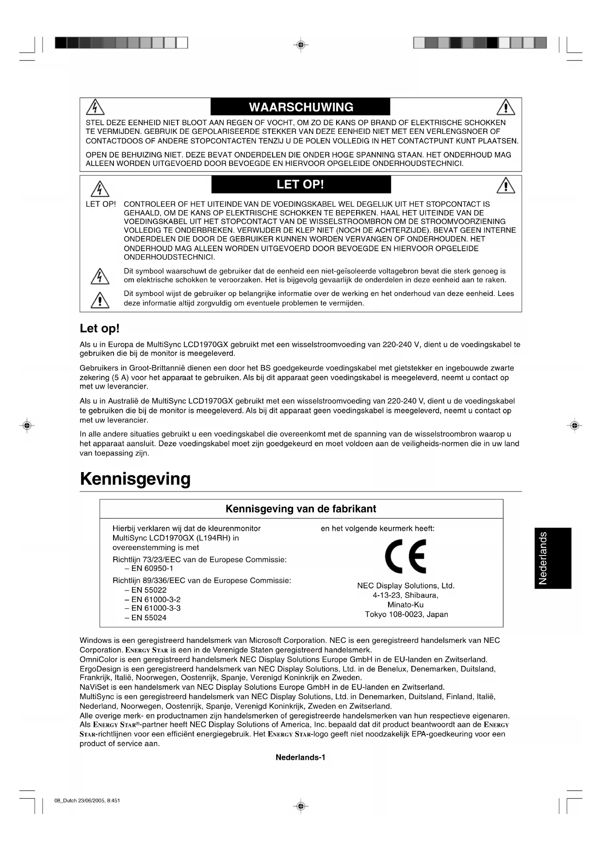 - Inumidire il panno con un detergente non aggressivo mischiato con dell’acqua, spolverare la carrozzeria e asciugare con un panno morbido. NOTA: La superficie della carrozzeria è ricoperta da diversi tipi di materie plastiche. NON pulire con benzene, detergente alcalino, detergente alcolico, detergente per vetri, cera, detergente per smalti, sapone in polvere o insetticidi. Evitare che gomme o sostanze viniliche abbiano un contatto prolungato con la carrozzeria. Questi tipi di fluidi e tessuti possono provocare il deterioramento della vernice, screpolature o spelature. 07_Italian 23/06/2005, 8:4410Nederlands Nederlands-1 WAARSCHUWING LET OP! CONTROLEER OF HET UITEINDE VAN DE VOEDINGSKABEL WEL DEGELIJK UIT HET STOPCONTACT IS GEHAALD, OM DE KANS OP ELEKTRISCHE SCHOKKEN TE BEPERKEN. HAAL HET UITEINDE VAN DE VOEDINGSKABEL UIT HET STOPCONTACT VAN DE WISSELSTROOMBRON OM DE STROOMVOORZIENING VOLLEDIG TE ONDERBREKEN. VERWIJDER DE KLEP NIET (NOCH DE ACHTERZIJDE). BEVAT GEEN INTERNE ONDERDELEN DIE DOOR DE GEBRUIKER KUNNEN WORDEN VERVANGEN OF ONDERHOUDEN. HET ONDERHOUD MAG ALLEEN WORDEN UITGEVOERD DOOR BEVOEGDE EN HIERVOOR OPGELEIDE ONDERHOUDSTECHNICI. Dit symbool waarschuwt de gebruiker dat de eenheid een niet-geïsoleerde voltagebron bevat die sterk genoeg is om elektrische schokken te veroorzaken. Het is bijgevolg gevaarlijk de onderdelen in deze eenheid aan te raken. Dit symbool wijst de gebruiker op belangrijke informatie over de werking en het onderhoud van deze eenheid. Lees deze informatie altijd zorgvuldig om eventuele problemen te vermijden. Let op! Als u in Europa de MultiSync LCD1970GX gebruikt met een wisselstroomvoeding van 220-240 V, dient u de voedingskabel te gebruiken die bij de monitor is meegeleverd. Gebruikers in Groot-Brittannië dienen een door het BS goedgekeurde voedingskabel met gietstekker en ingebouwde zwarte zekering (5 A) voor het apparaat te gebruiken. Als bij dit apparaat geen voedingskabel is meegeleverd, neemt u contact op met uw leverancier. Als u in Australië de MultiSync LCD1970GX gebruikt met een wisselstroomvoeding van 220-240 V, dient u de voedingskabel te gebruiken die bij de monitor is meegeleverd. Als bij dit apparaat geen voedingskabel is meegeleverd, neemt u contact op met uw leverancier. In alle andere situaties gebruikt u een voedingskabel die overeenkomt met de spanning van de wisselstroombron waarop u het apparaat aansluit. Deze voedingskabel moet zijn goedgekeurd en moet voldoen aan de veiligheids-normen die in uw land van toepassing zijn. STEL DEZE EENHEID NIET BLOOT AAN REGEN OF VOCHT, OM ZO DE KANS OP BRAND OF ELEKTRISCHE SCHOKKEN TE VERMIJDEN. GEBRUIK DE GEPOLARISEERDE STEKKER VAN DEZE EENHEID NIET MET EEN VERLENGSNOER OF CONTACTDOOS OF ANDERE STOPCONTACTEN TENZIJ U DE POLEN VOLLEDIG IN HET CONTACTPUNT KUNT PLAATSEN. OPEN DE BEHUIZING NIET. DEZE BEVAT ONDERDELEN DIE ONDER HOGE SPANNING STAAN. HET ONDERHOUD MAG ALLEEN WORDEN UITGEVOERD DOOR BEVOEGDE EN HIERVOOR OPGELEIDE ONDERHOUDSTECHNICI. LET OP! Kennisgeving Kennisgeving van de fabrikant Hierbij verklaren wij dat de kleurenmonitor MultiSync LCD1970GX (L194RH) in overeenstemming is met Richtlijn 73/23/EEC van de Europese Commissie: – EN 60950-1 Richtlijn 89/336/EEC van de Europese Commissie: – EN 55022 – EN 61000-3-2 – EN 61000-3-3 – EN 55024 en het volgende keurmerk heeft: NEC Display Solutions, Ltd. 4-13-23, Shibaura, Minato-Ku Tokyo 108-0023, Japan Windows is een geregistreerd handelsmerk van Microsoft Corporation. NEC is een geregistreerd handelsmerk van NEC Corporation. ENERGY STAR is een in de Verenigde Staten geregistreerd handelsmerk. OmniColor is een geregistreerd handelsmerk NEC Display Solutions Europe GmbH in de EU-landen en Zwitserland. ErgoDesign is een geregistreerd handelsmerk van NEC Display Solutions, Ltd. in de Benelux, Denemarken, Duitsland, Frankrijk, Italië, Noorwegen, Oostenrijk, Spanje, Verenigd Koninkrijk en Zweden. NaViSet is een handelsmerk van NEC Display Solutions Europe GmbH in de EU-landen en Zwitserland. MultiSync is een geregistreerd handelsmerk van NEC Display Solutions, Ltd. in Denemarken, Duitsland, Finland, Italië, Nederland, Noorwegen, Oostenrijk, Spanje, Verenigd Koninkrijk, Zweden en Zwitserland. Alle overige merk- en productnamen zijn handelsmerken of geregistreerde handelsmerken van hun respectieve eigenaren. Als ENERGY STAR