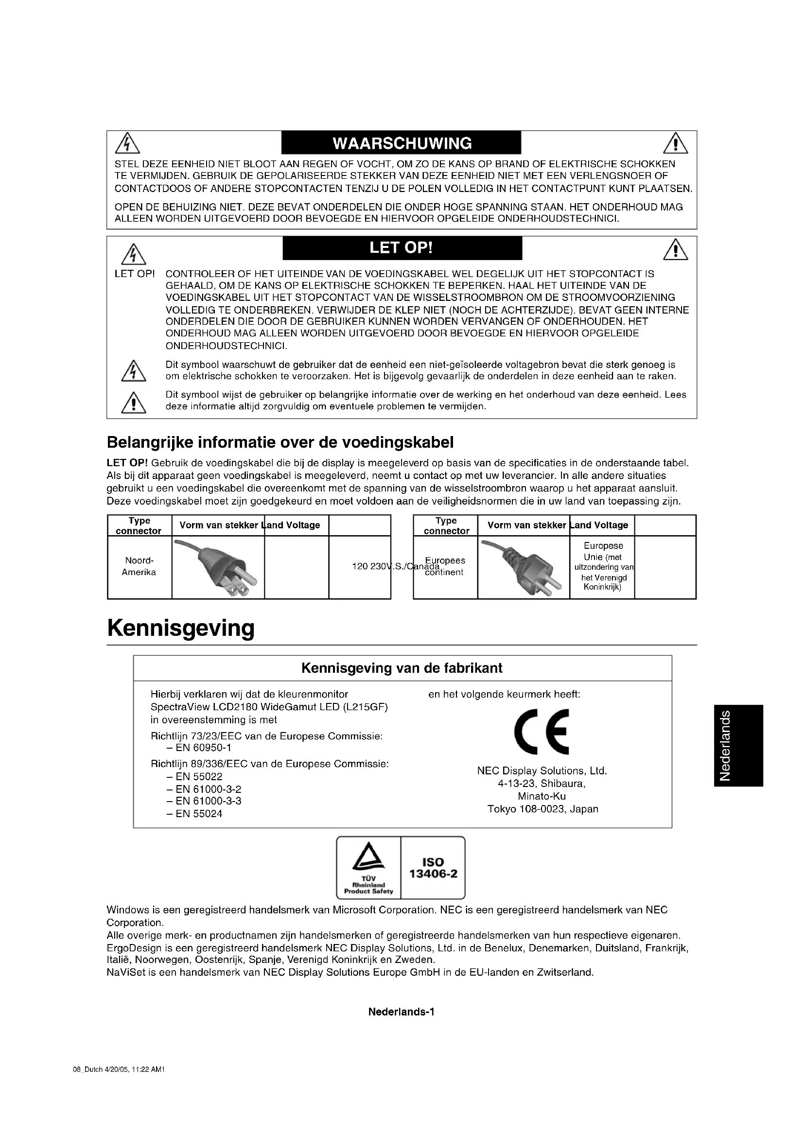 - Inumidire il panno con un detergente non aggressivo mischiato con dell’acqua, spolverare la carrozzeria e asciugare con un panno morbido. NOTA: La superficie della carrozzeria è ricoperta da diversi tipi di materie plastiche. NON pulire con benzene, detergente alcalino, detergente alcolico, detergente per vetri, cera, detergente per smalti, sapone in polvere o insetticidi. Evitare che gomme o sostanze viniliche abbiano un contatto prolungato con la carrozzeria. Questi tipi di fluidi e tessuti possono provocare il deterioramento della vernice, screpolature o spelature. 07_Italian 4/20/05, 11:22 AM8Nederlands Nederlands-1 WAARSCHUWING LET OP! LET OP! CONTROLEER OF HET UITEINDE VAN DE VOEDINGSKABEL WEL DEGELIJK UIT HET STOPCONTACT IS GEHAALD, OM DE KANS OP ELEKTRISCHE SCHOKKEN TE BEPERKEN. HAAL HET UITEINDE VAN DE VOEDINGSKABEL UIT HET STOPCONTACT VAN DE WISSELSTROOMBRON OM DE STROOMVOORZIENING VOLLEDIG TE ONDERBREKEN. VERWIJDER DE KLEP NIET (NOCH DE ACHTERZIJDE). BEVAT GEEN INTERNE ONDERDELEN DIE DOOR DE GEBRUIKER KUNNEN WORDEN VERVANGEN OF ONDERHOUDEN. HET ONDERHOUD MAG ALLEEN WORDEN UITGEVOERD DOOR BEVOEGDE EN HIERVOOR OPGELEIDE ONDERHOUDSTECHNICI. Dit symbool waarschuwt de gebruiker dat de eenheid een niet-geïsoleerde voltagebron bevat die sterk genoeg is om elektrische schokken te veroorzaken. Het is bijgevolg gevaarlijk de onderdelen in deze eenheid aan te raken. Dit symbool wijst de gebruiker op belangrijke informatie over de werking en het onderhoud van deze eenheid. Lees deze informatie altijd zorgvuldig om eventuele problemen te vermijden. STEL DEZE EENHEID NIET BLOOT AAN REGEN OF VOCHT, OM ZO DE KANS OP BRAND OF ELEKTRISCHE SCHOKKEN TE VERMIJDEN. GEBRUIK DE GEPOLARISEERDE STEKKER VAN DEZE EENHEID NIET MET EEN VERLENGSNOER OF CONTACTDOOS OF ANDERE STOPCONTACTEN TENZIJ U DE POLEN VOLLEDIG IN HET CONTACTPUNT KUNT PLAATSEN. OPEN DE BEHUIZING NIET. DEZE BEVAT ONDERDELEN DIE ONDER HOGE SPANNING STAAN. HET ONDERHOUD MAG ALLEEN WORDEN UITGEVOERD DOOR BEVOEGDE EN HIERVOOR OPGELEIDE ONDERHOUDSTECHNICI. Kennisgeving Kennisgeving van de fabrikant Hierbij verklaren wij dat de kleurenmonitor SpectraView LCD2180 WideGamut LED (L215GF) in overeenstemming is met Richtlijn 73/23/EEC van de Europese Commissie: – EN 60950-1 Richtlijn 89/336/EEC van de Europese Commissie: – EN 55022 – EN 61000-3-2 – EN 61000-3-3 – EN 55024 en het volgende keurmerk heeft: NEC Display Solutions, Ltd. 4-13-23, Shibaura, Minato-Ku Tokyo 108-0023, Japan Windows is een geregistreerd handelsmerk van Microsoft Corporation. NEC is een geregistreerd handelsmerk van NEC Corporation. Alle overige merk- en productnamen zijn handelsmerken of geregistreerde handelsmerken van hun respectieve eigenaren. ErgoDesign is een geregistreerd handelsmerk NEC Display Solutions, Ltd. in de Benelux, Denemarken, Duitsland, Frankrijk, Italië, Noorwegen, Oostenrijk, Spanje, Verenigd Koninkrijk en Zweden. NaViSet is een handelsmerk van NEC Display Solutions Europe GmbH in de EU-landen en Zwitserland. Belangrijke informatie over de voedingskabel LET OP! Gebruik de voedingskabel die bij de display is meegeleverd op basis van de specificaties in de onderstaande tabel. Als bij dit apparaat geen voedingskabel is meegeleverd, neemt u contact op met uw leverancier. In alle andere situaties gebruikt u een voedingskabel die overeenkomt met de spanning van de wisselstroombron waarop u het apparaat aansluit. Deze voedingskabel moet zijn goedgekeurd en moet voldoen aan de veiligheidsnormen die in uw land van toepassing zijn. EuropeescontinentNoord-AmerikaVorm van stekker Land Voltage120 230V.S./CanadaEuropeseUnie (metuitzondering vanhet VerenigdKoninkrijk) Type connectorVorm van stekker Land VoltageTypeconnector08_Dutch 4/20/05, 11:22 AM1Nederlands-2