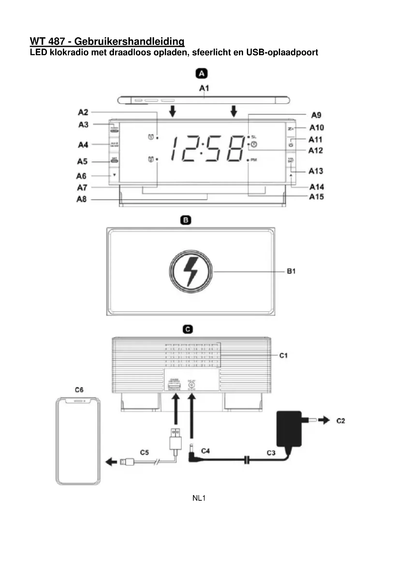 A1: Plaats een mobiel apparaat (niet meegeverd) op de klokradio voor draadloos opladen