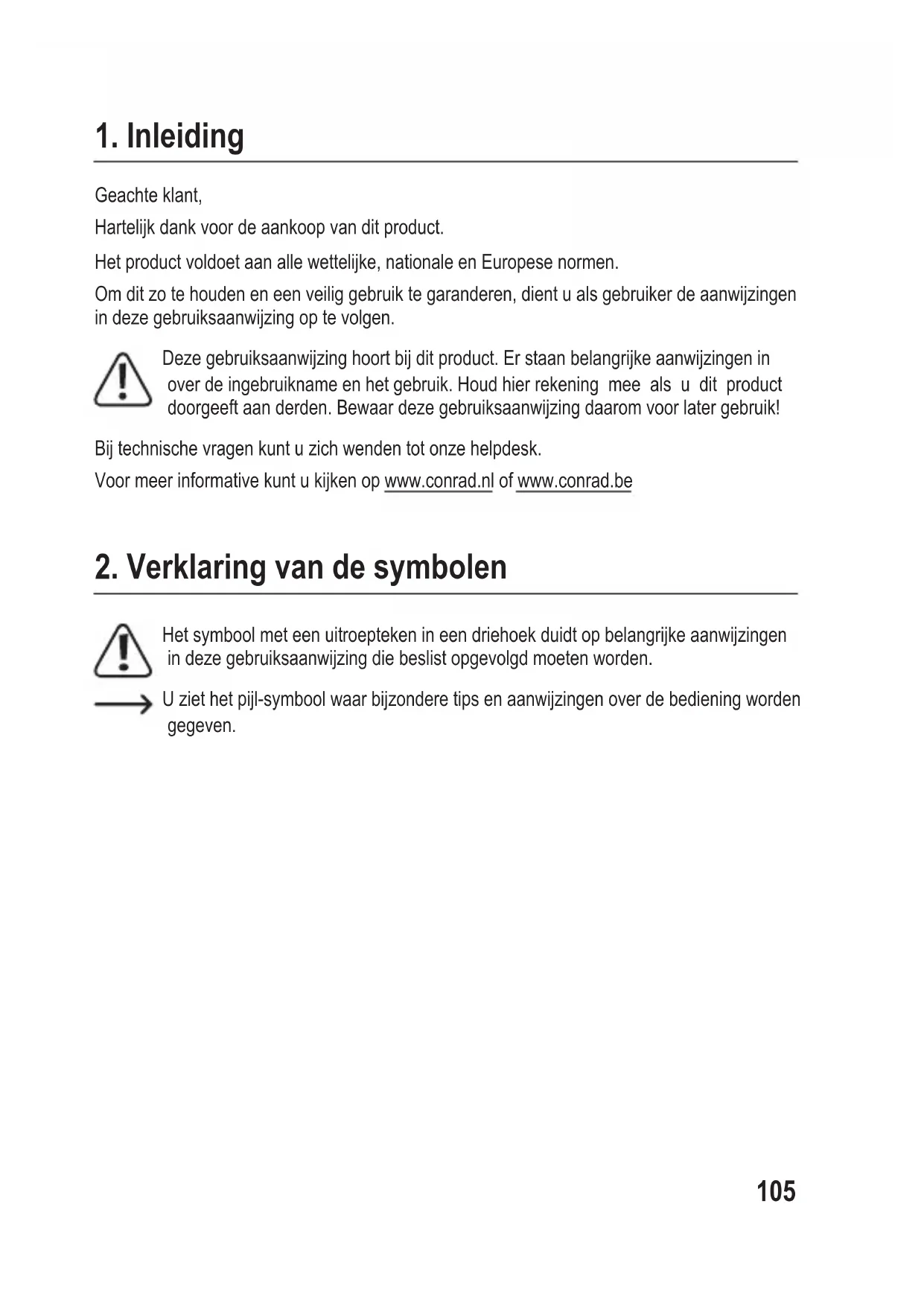 Download de meest recente gebruiksaanwijzing via de link www.conrad.com/downloadsofscandeafgebeeldeQR-Code.Volgde instructies op de website. 1077. Veiligheidsinstructies Lees de gebruiksaanwijzing zorgvuldig door en let vooral op de veiligheidsinstructies. Als u de veiligheidsinstructies en de aanwijzingen voor een juiste bediening in deze gebruiksaanwijzing niet opvolgt, kunnen wij niet aansprakelijk worden gesteld voor het daardoor ontstane persoonlijke letsel of schade aan voorwerpen. Bovendien vervalt in dergelijke gevallen de aansprakelijkheid/garantie. Algemeen