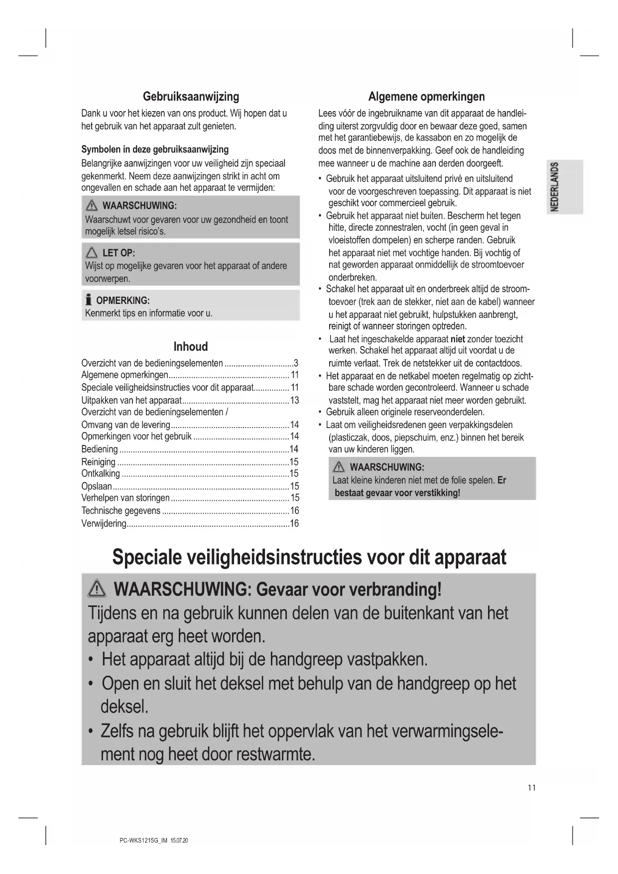 wanneer beschadingen worden geconstateerd, het apparaat niet gebruiken. Breng het apparaat terug naar de leverancier. OPMERKING: Er kan stof en productieresidu op het apparaat aanwezig zijn. We raden u aan het apparaat reinigen zoals beschre- ven in het hoofdstuk “Reiniging”.PC-WKS1215G_IM 15.07.20
