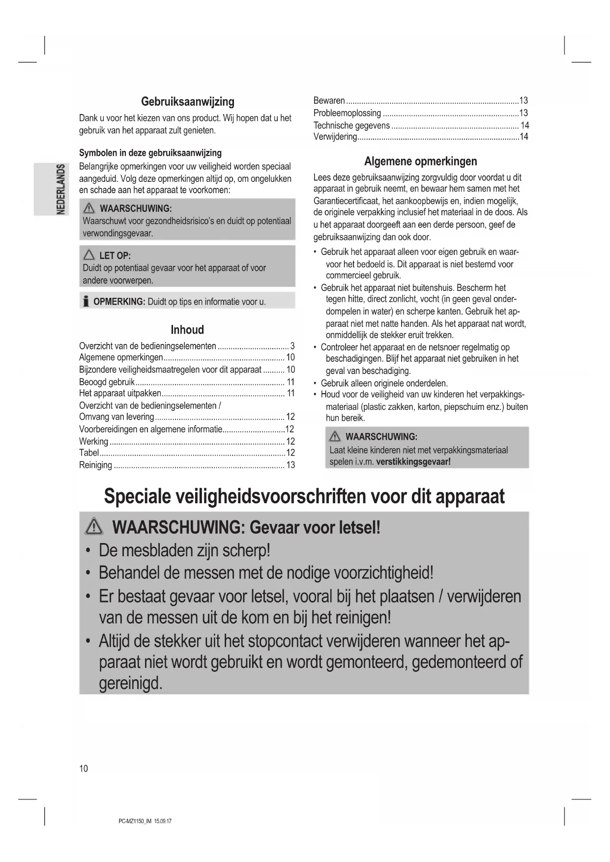 beschadigingen worden gevonden, neem het apparaat dan niet in gebruik. Breng het onmiddellijk terug naar de leverancier. OPMERKING: Verwijder productieresten en stof van het apparaat zoals beschreven onder “Reiniging”.12 PC-MZ1150_IM 15.09.17 Overzicht van de bedieningselementen / Omvang van levering 1 Schakelaar (Instelling I) 2 Schakelaar (Instelling II) 3 Motorbehuizing 4 Siliconen geleidering 5 Veiligheidsdeksel 6 Afdichtring 7 Twee messen 8 Kom 9 Geleidebout 10 Antislip rubber ring Geen afbeelding: Messenbeschermer (4 stuks) Voorbereidingen en algemene informatie