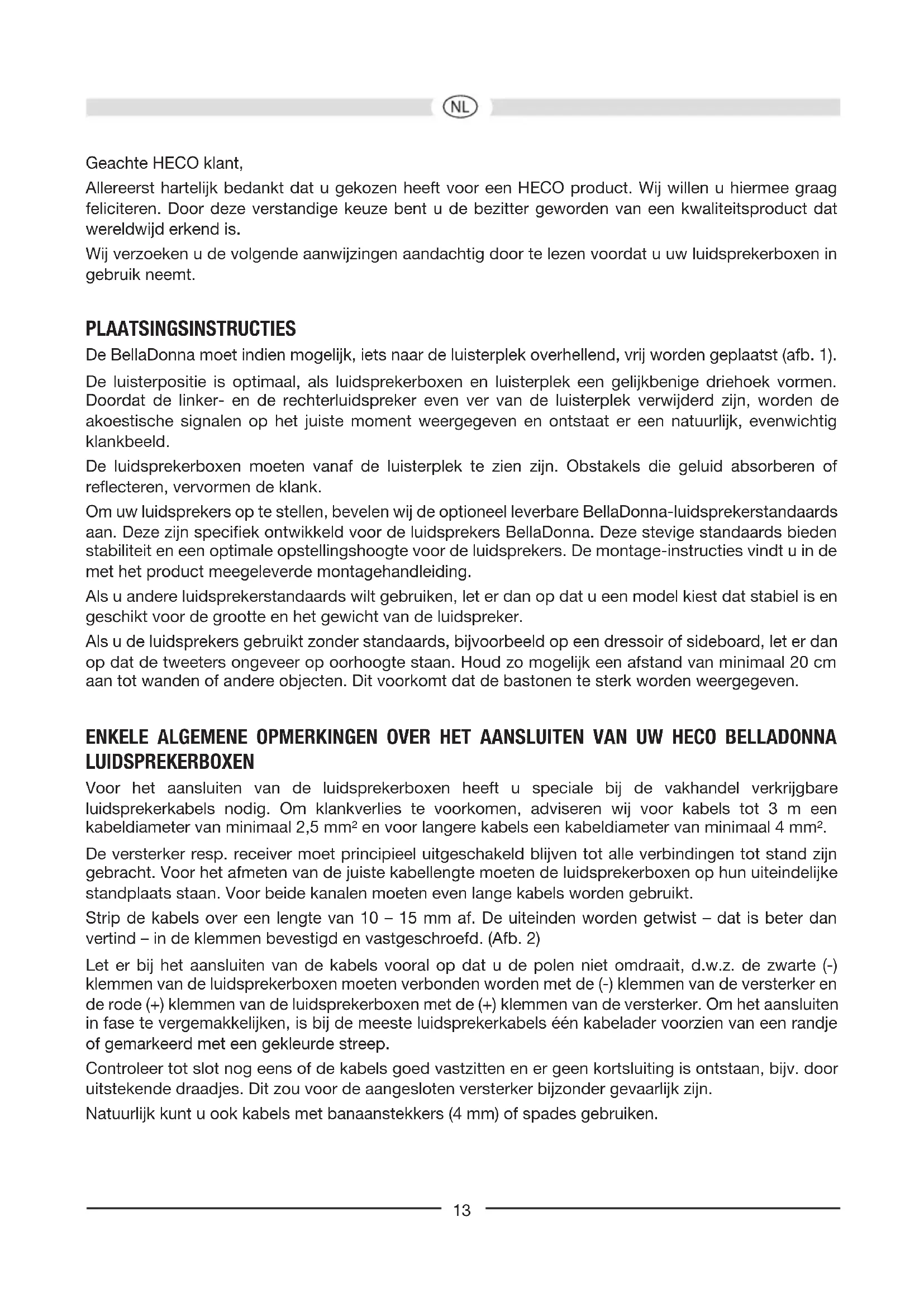 Geachte HECO klant, Allereerst hartelijk bedankt dat u gekozen heeft voor een HECO product. Wij willen u hiermee graag feliciteren. Door deze verstandige keuze bent u de bezitter geworden van een kwaliteitsproduct dat wereldwijd erkend is. Wij verzoeken u de volgende aanwijzingen aandachtig door te lezen voordat u uw luidsprekerboxen in gebruik neemt. PLAATSINGSINSTRUCTIES De BellaDonna moet indien mogelijk, iets naar de luisterplek overhellend, vrij worden geplaatst (afb. 1). De luisterpositie is optimaal, als luidsprekerboxen en luisterplek een gelijkbenige driehoek vormen. Doordat de linker- en de rechterluidspreker even ver van de luisterplek verwijderd zijn, worden de akoestische signalen op het juiste moment weergegeven en ontstaat er een natuurlijk, evenwichtig klankbeeld. De luidsprekerboxen moeten vanaf de luisterplek te zien zijn. Obstakels die geluid absorberen of reecteren, vervormen de klank. Om uw luidsprekers op te stellen, bevelen wij de optioneel leverbare BellaDonna-luidsprekerstandaards aan. Deze zijn speciek ontwikkeld voor de luidsprekers BellaDonna. Deze stevige standaards bieden stabiliteit en een optimale opstellingshoogte voor de luidsprekers. De montage-instructies vindt u in de met het product meegeleverde montagehandleiding. Als u andere luidsprekerstandaards wilt gebruiken, let er dan op dat u een model kiest dat stabiel is en geschikt voor de grootte en het gewicht van de luidspreker. Als u de luidsprekers gebruikt zonder standaards, bijvoorbeeld op een dressoir of sideboard, let er dan op dat de tweeters ongeveer op oorhoogte staan. Houd zo mogelijk een afstand van minimaal 20 cm aan tot wanden of andere objecten. Dit voorkomt dat de bastonen te sterk worden weergegeven. ENKELE ALGEMENE OPMERKINGEN OVER HET AANSLUITEN VAN UW HECO BELLADONNA LUIDSPREKERBOXEN Voor het aansluiten van de luidsprekerboxen heeft u speciale bij de vakhandel verkrijgbare luidsprekerkabels nodig. Om klankverlies te voorkomen, adviseren wij voor kabels tot 3 m een kabeldiameter van minimaal 2,5 mm² en voor langere kabels een kabeldiameter van minimaal 4 mm². De versterker resp. receiver moet principieel uitgeschakeld blijven tot alle verbindingen tot stand zijn gebracht. Voor het afmeten van de juiste kabellengte moeten de luidsprekerboxen op hun uiteindelijke standplaats staan. Voor beide kanalen moeten even lange kabels worden gebruikt. Strip de kabels over een lengte van 10 – 15 mm af. De uiteinden worden getwist – dat is beter dan vertind – in de klemmen bevestigd en vastgeschroefd. (Afb. 2) Let er bij het aansluiten van de kabels vooral op dat u de polen niet omdraait, d.w.z. de zwarte (-) klemmen van de luidsprekerboxen moeten verbonden worden met de (-) klemmen van de versterker en de rode (+) klemmen van de luidsprekerboxen met de (+) klemmen van de versterker. Om het aansluiten in fase te vergemakkelijken, is bij de meeste luidsprekerkabels één kabelader voorzien van een randje of gemarkeerd met een gekleurde streep. Controleer tot slot nog eens of de kabels goed vastzitten en er geen kortsluiting is ontstaan, bijv. door uitstekende draadjes. Dit zou voor de aangesloten versterker bijzonder gevaarlijk zijn. Natuurlijk kunt u ook kabels met banaanstekkers (4 mm) of spades gebruiken.14 HET AANSLUITVELD VAN DE HECO BELLADONNA LUIDSPREKERS / BI-WIRING EN BI-AMPING De aansluitvelden van de BellaDonna luidsprekers zijn uitgerust met vijf schroefklemmen, die behalve de conventionele aansluiting op een versterker ook de optie bi-wiring/bi-amping mogelijk maken. De bovenste klemmen zijn verbonden met de scheidingslter, de onderste klemmen met de lagetonenaftakking. Door een extra aansluitklem kan een hoogophaling met 2dB worden gekozen. (Afb. 3B, 4B, 5B) Bi-wiring betekent dat de hoge en de lage frequenties via afzonderlijke kabels worden overgedragen. Voor bi-amping is er, zoals de naam al doet vermoeden, naast een tweede kabel ook een tweede eindversterker nodig. Vooral met de laatste methode kan de weergavekwaliteit nog eens aanzienlijk worden verbeterd.