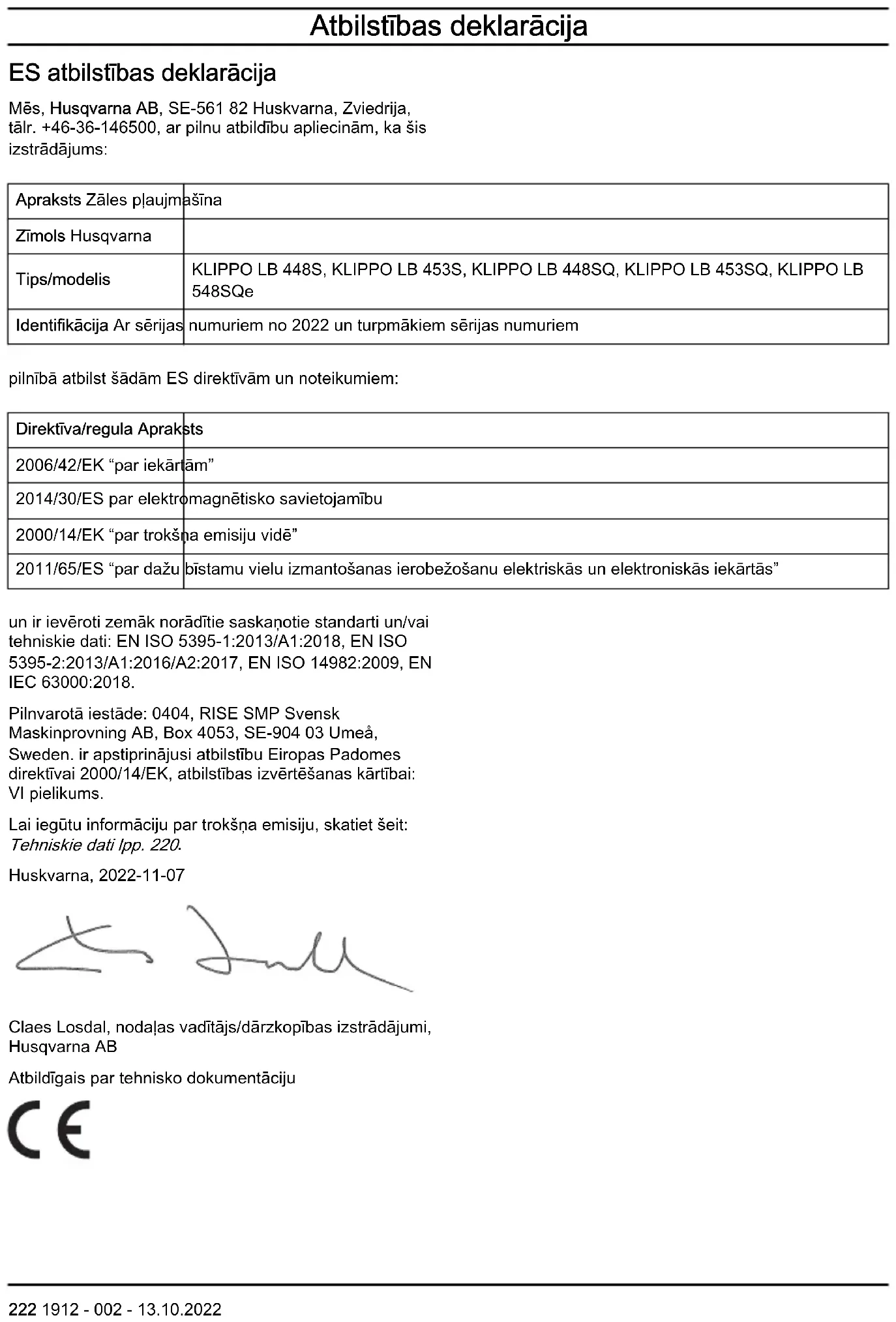 234 1912 - 002 - 13.10.2022Verklaring van overeenstemming EU-verklaring van overeenstemming Wij, Husqvarna AB, SE-561 82 Huskvarna, Zweden, tel: +46-36-146500, verklaren onder onze alleenverantwoordelijkheid dat het product: Beschrijving Gazonmaaier Merk Husqvarna Type / model KLIPPO LB 448S, KLIPPO LB 453S, KLIPPO LB 448SQ, KLIPPO LB 453SQ, KLIPPO LB 548SQe Identificatie Serienummers vanaf 2022 en verder volledig voldoet aan de volgende EU-richtlijnen en -regelgeving: Richtlijn/Verordening Beschrijving 2006/42/EG "betreffende machines" 2014/30/EU "betreffende elektromagnetische compatibiliteit" 2000/14/EG "betreffende de geluidsemissies in het milieu" 2011/65/EU "inzake beperking van het gebruik van bepaalde gevaarlijke stoffen in elektrische en elektro- nische apparatuur" en dat de volgende normen en/of technische specificaties zijn toegepast: EN ISO 5395-1:2013/ A1:2018, EN ISO 5395-2:2013/A1:2016/A2:2017, EN ISO 14982:2009, EN IEC 63000:2018. Aangemelde instantie: 0404, RISE SMP Svensk Maskinprovning AB, Box 4053, SE-904 03 Umeå, Sweden. is gecertificeerd conform Richtlijn 2000/14/EG van de Raad, beoordelingsprocedure voor conformiteit: Bijlage VI. Voor informatie over geluidsemissies, zie Technische gegevens op pagina 233