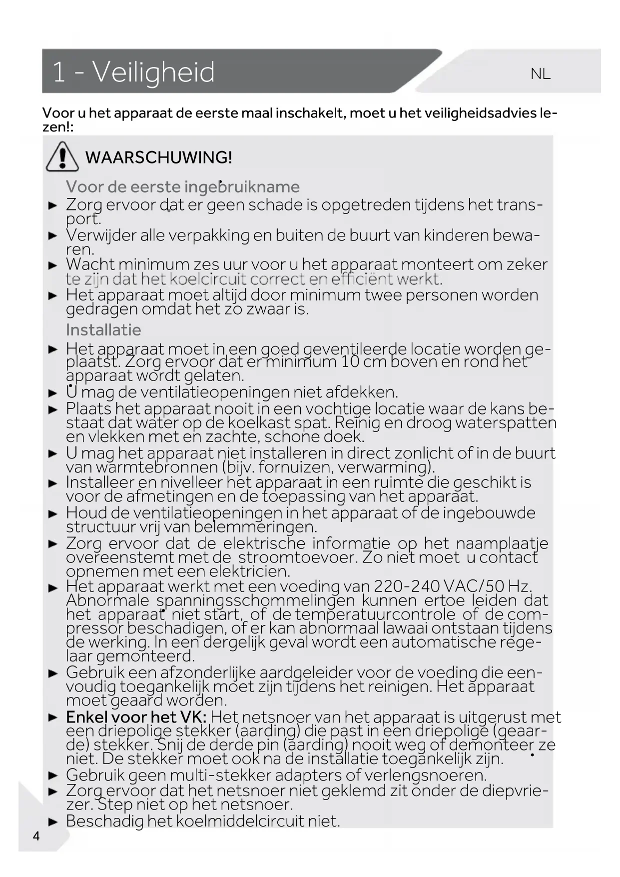 de) stekker. Snij de derde pin (aarding) nooit weg of demonteer ze niet. De stekker moet ook na de installatie toegankelijk zijn. Gebruik geen multi-stekker adapters of verlengsnoeren. Zorg ervoor dat het netsnoer niet geklemd zit onder de diepvrie- zer. Step niet op het netsnoer. Beschadig het koelmiddelcircuit niet.