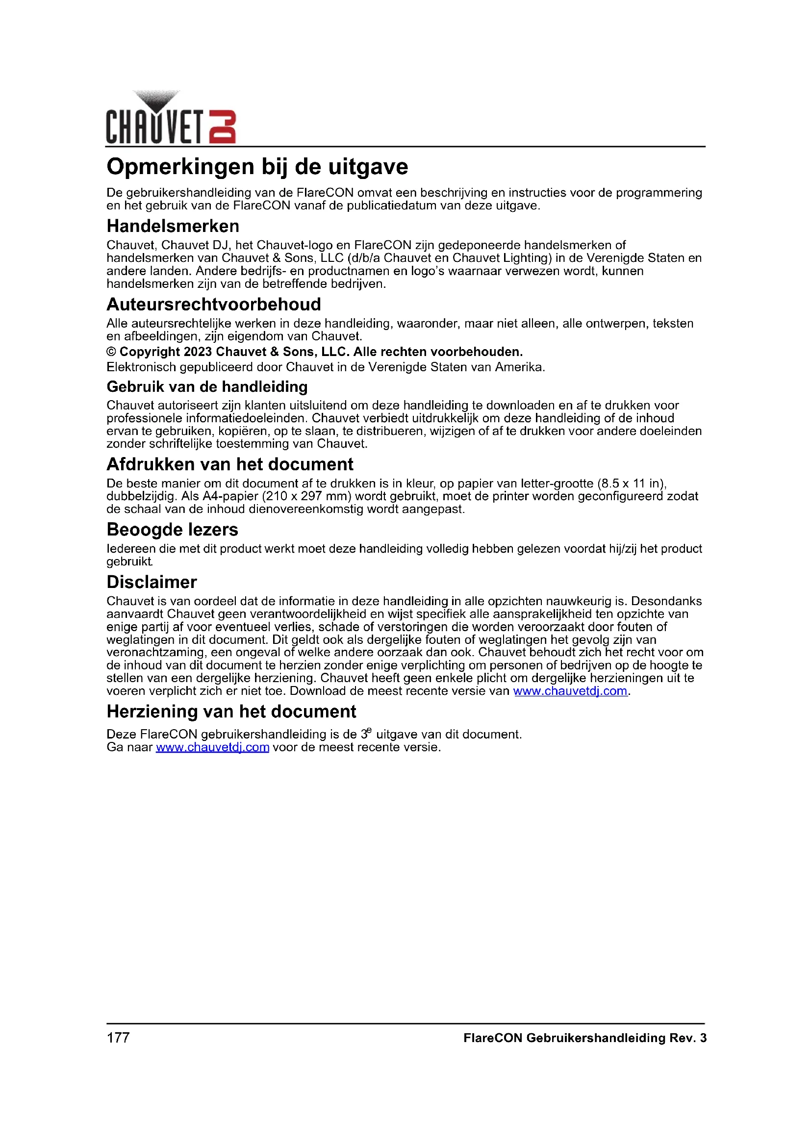 Opmerkingen bij de uitgave De gebruikershandleiding van de FlareCON omvat een beschrijving en instructies voor de programmering en het gebruik van de FlareCON vanaf de publicatiedatum van deze uitgave. Handelsmerken Chauvet, Chauvet DJ, het Chauvet-logo en FlareCON zijn gedeponeerde handelsmerken of handelsmerken van Chauvet & Sons, LLC (d/b/a Chauvet en Chauvet Lighting) in de Verenigde Staten en andere landen. Andere bedrijfs- en productnamen en logo’s waarnaar verwezen wordt, kunnen handelsmerken zijn van de betreffende bedrijven. Auteursrechtvoorbehoud Alle auteursrechtelijke werken in deze handleiding, waaronder, maar niet alleen, alle ontwerpen, teksten en afbeeldingen, zijn eigendom van Chauvet. © Copyright 2023 Chauvet & Sons, LLC. Alle rechten voorbehouden. Elektronisch gepubliceerd door Chauvet in de Verenigde Staten van Amerika. Gebruik van de handleiding Chauvet autoriseert zijn klanten uitsluitend om deze handleiding te downloaden en af te drukken voor professionele informatiedoeleinden. Chauvet verbiedt uitdrukkelijk om deze handleiding of de inhoud ervan te gebruiken, kopiëren, op te slaan, te distribueren, wijzigen of af te drukken voor andere doeleinden zonder schriftelijke toestemming van Chauvet. Afdrukken van het document De beste manier om dit document af te drukken is in kleur, op papier van letter-grootte (8.5 x 11 in), dubbelzijdig. Als A4-papier (210 x 297 mm) wordt gebruikt, moet de printer worden geconfigureerd zodat de schaal van de inhoud dienovereenkomstig wordt aangepast. Beoogde lezers Iedereen die met dit product werkt moet deze handleiding volledig hebben gelezen voordat hij/zij het product gebruikt