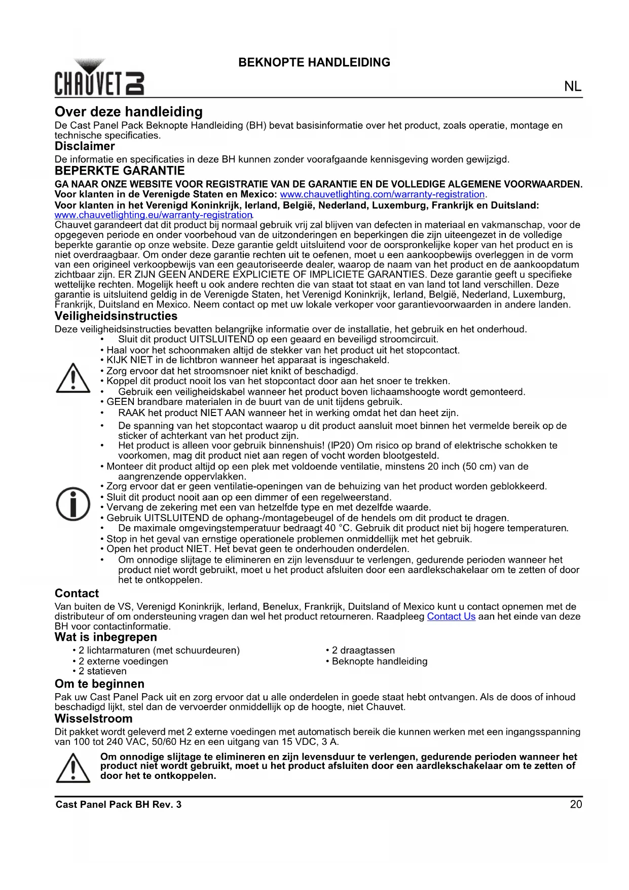 Chauvet garandeert dat dit product bij normaal gebruik vrij zal blijven van defecten in materiaal en vakmanschap, voor de opgegeven periode en onder voorbehoud van de uitzonderingen en beperkingen die zijn uiteengezet in de volledige beperkte garantie op onze website. Deze garantie geldt uitsluitend voor de oorspronkelijke koper van het product en is niet overdraagbaar. Om onder deze garantie rechten uit te oefenen, moet u een aankoopbewijs overleggen in de vorm van een origineel verkoopbewijs van een geautoriseerde dealer, waarop de naam van het product en de aankoopdatum zichtbaar zijn. ER ZIJN GEEN ANDERE EXPLICIETE OF IMPLICIETE GARANTIES. Deze garantie geeft u specifieke wettelijke rechten. Mogelijk heeft u ook andere rechten die van staat tot staat en van land tot land verschillen. Deze garantie is uitsluitend geldig in de Verenigde Staten, het Verenigd Koninkrijk, Ierland, België, Nederland, Luxemburg, Frankrijk, Duitsland en Mexico. Neem contact op met uw lokale verkoper voor garantievoorwaarden in andere landen. Veiligheidsinstructies Deze veiligheidsinstructies bevatten belangrijke informatie over de installatie, het gebruik en het onderhoud. Contact Van buiten de VS, Verenigd Koninkrijk, Ierland, Benelux, Frankrijk, Duitsland of Mexico kunt u contact opnemen met de distributeur of om ondersteuning vragen dan wel het product retourneren. Raadpleeg Contact Us aan het einde van deze BH voor contactinformatie. Wat is inbegrepen Om te beginnen Pak uw Cast Panel Pack uit en zorg ervoor dat u alle onderdelen in goede staat hebt ontvangen. Als de doos of inhoud beschadigd lijkt, stel dan de vervoerder onmiddellijk op de hoogte, niet Chauvet. Wisselstroom Dit pakket wordt geleverd met 2 externe voedingen met automatisch bereik die kunnen werken met een ingangsspanning van 100 tot 240 VAC, 50/60 Hz en een uitgang van 15 VDC, 3 A.