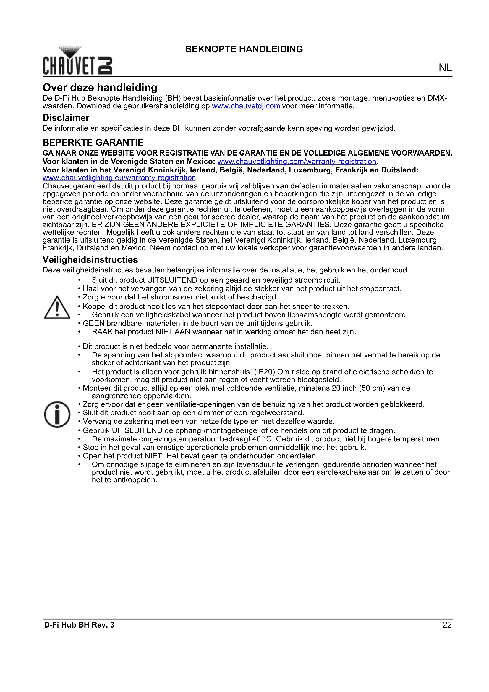 D-Fi Hub BH Rev. 3 BEKNOPTE HANDLEIDING Over deze handleiding De D-Fi Hub Beknopte Handleiding (BH) bevat basisinformatie over het product, zoals montage, menu-opties en DMX- waarden. Download de gebruikershandleiding op www.chauvetdj.com voor meer informatie. Disclaimer De informatie en specificaties in deze BH kunnen zonder voorafgaande kennisgeving worden gewijzigd. BEPERKTE GARANTIE GA NAAR ONZE WEBSITE VOOR REGISTRATIE VAN DE GARANTIE EN DE VOLLEDIGE ALGEMENE VOORWAARDEN. Voor klanten in de Verenigde Staten en Mexico: www.chauvetlighting.com/warranty-registration. Voor klanten in het Verenigd Koninkrijk, Ierland, België, Nederland, Luxemburg, Frankrijk en Duitsland: www.chauvetlighting.eu/warranty-registration
