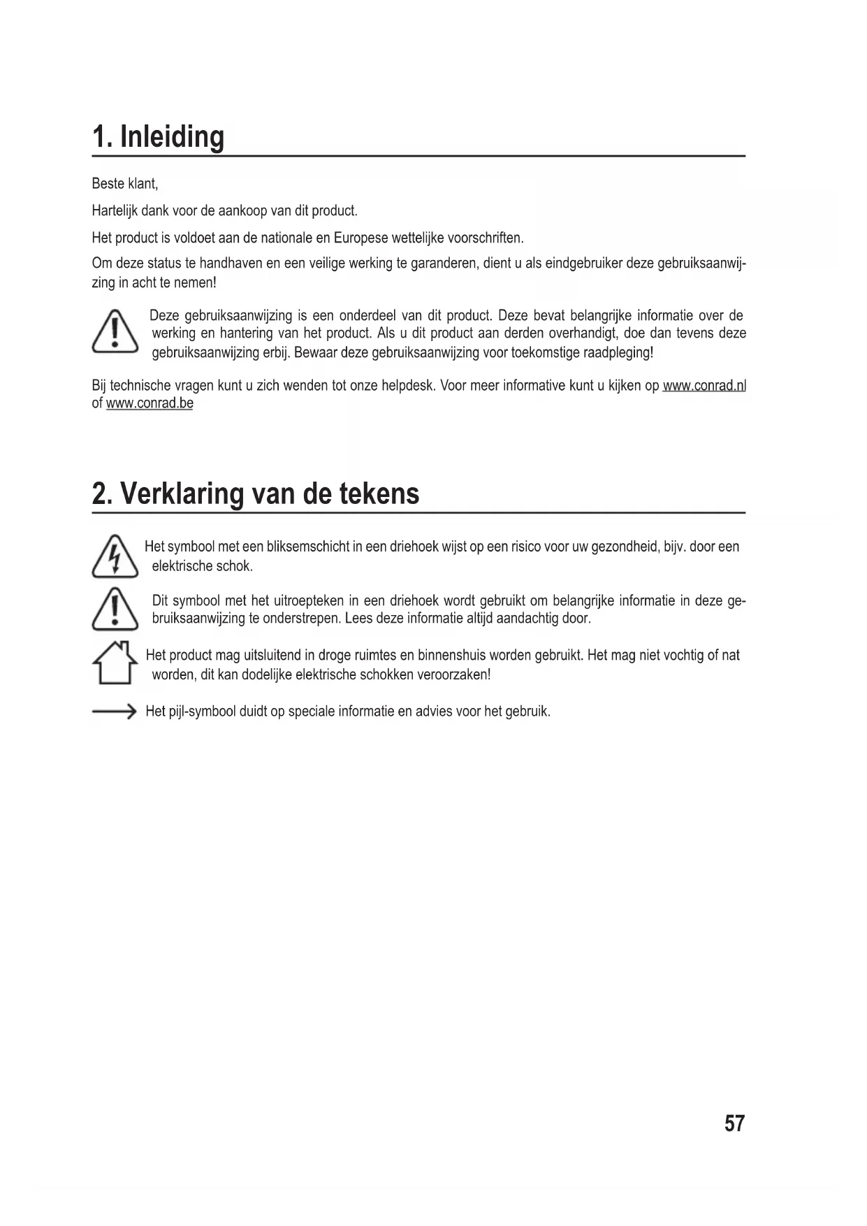 Beste klant, Hartelijk dank voor de aankoop van dit product. Het product is voldoet aan de nationale en Europese wettelijke voorschriften. Om deze status te handhaven en een veilige werking te garanderen, dient u als eindgebruiker deze gebruiksaanwij- zing in acht te nemen! Deze gebruiksaanwijzing is een onderdeel van dit product. Deze bevat belangrijke informatie over de werking en hantering van het product. Als u dit product aan derden overhandigt, doe dan tevens deze gebruiksaanwijzing erbij. Bewaar deze gebruiksaanwijzing voor toekomstige raadpleging! Bij technische vragen kunt u zich wenden tot onze helpdesk. Voor meer informative kunt u kijken op www.conrad.nl of www.conrad.be