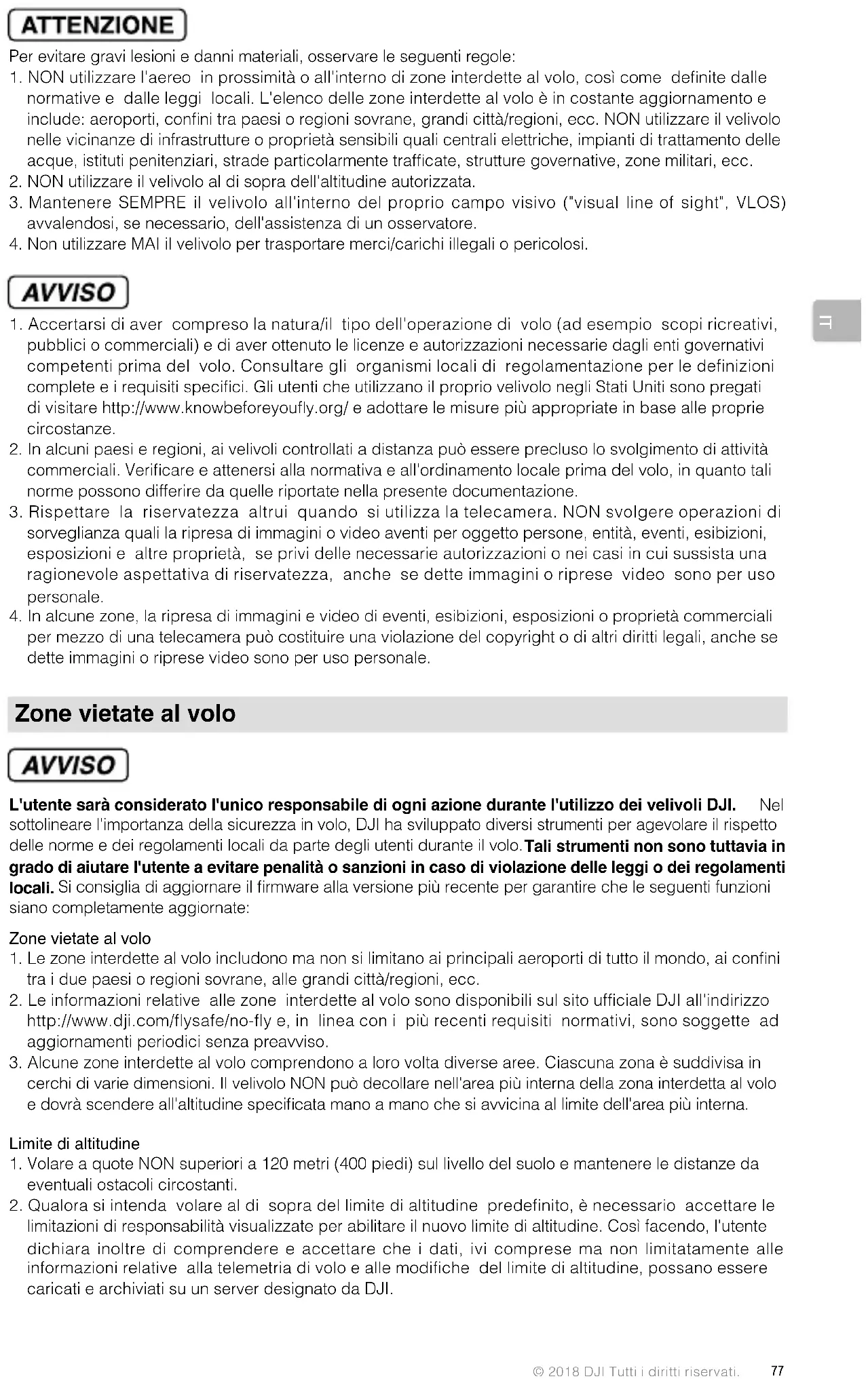 Inhoud Veiligheid in één oogopslag 78 OPMERKING 80 Woordenlijst 80 Controlelijst ter voorbereiding van de vlucht 80 Disclaimer en waarschuwing 81 Voordat je begint 82 Afzonderlijke onderdelen 82 Zorg voor het product 85 Vereisten voor vluchtcondities 86 Vluchtmodi, functies en waarschuwingen 87 Naleving van regelgeving en no-fly zones 91© 2018 DJI All Rights Reserved.
