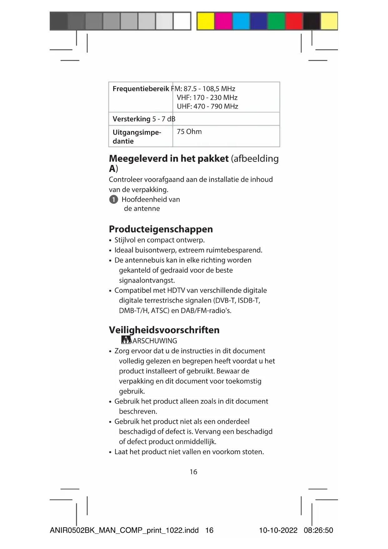 Snelstartgids TV-antenne voor binnen ANIR0502BK Bedoeld gebruik Het product is een antenne die gebruikt kan worden met een tv of settopbox die voeding via de coaxkabel ondersteunt. Dit is een antenne die speciaal is ontworpen voor ontvangst van digitale terrestrische tv-uitzendingen. Het product is enkel bedoeld voor gebruik binnenshuis. Technische gegevens Product TV-antenne voor binnen Artikelnummer ANIR0502BK Ingangsvermo- gen Passief ANIR0502BK_MAN_COMP_print_1022.indd 15ANIR0502BK_MAN_COMP_print_1022.indd 15 10-10-2022 08:26:5010-10-2022 08:26:5016 Frequentiebereik FM: 87.5 - 108,5 MHz VHF: 170 - 230 MHz UHF: 470 - 790 MHz Versterking 5 - 7 dB Uitgangsimpe- dantie 75 Ohm Meegeleverd in het pakket (afbeelding