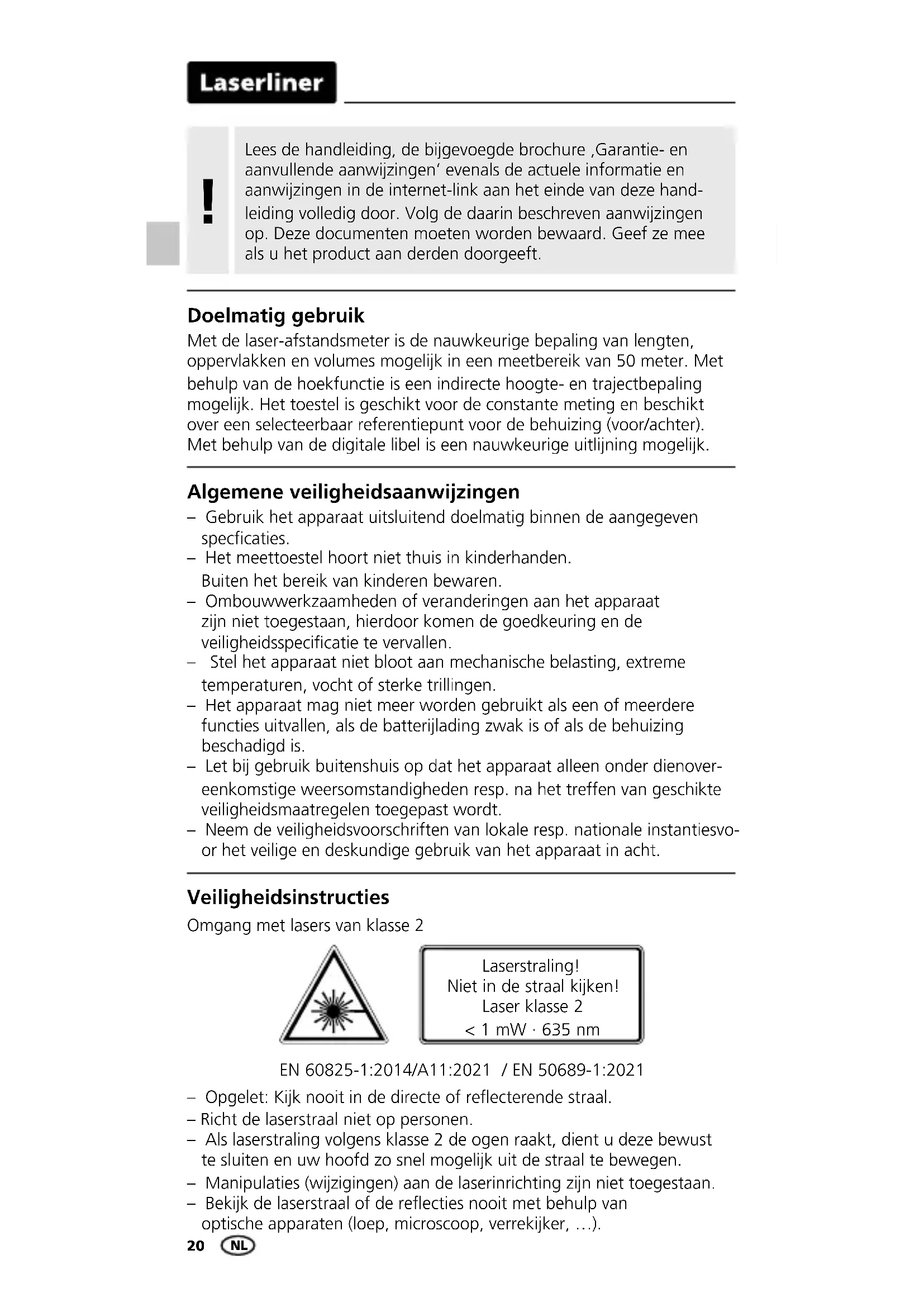 Met de laser-afstandsmeter is de nauwkeurige bepaling van lengten, oppervlakken en volumes mogelijk in een meetbereik van 50 meter. Met behulp van de hoekfunctie is een indirecte hoogte- en trajectbepaling mogelijk. Het toestel is geschikt voor de constante meting en beschikt over een selecteerbaar referentiepunt voor de behuizing (voor/achter). Met behulp van de digitale libel is een nauwkeurige uitlijning mogelijk. Laserstraling! Niet in de straal kijken! Laser klasse 2 < 1 mW · 635 nm EN 60825-1:2014/A11:2021 / EN 50689-1:2021 – Gebruik het apparaat uitsluitend doelmatig binnen de aangegeven speccaties. – Het meettoestel hoort niet thuis in kinderhanden. Buiten het bereik van kinderen bewaren. – Ombouwwerkzaamheden of veranderingen aan het apparaat zijn niet toegestaan, hierdoor komen de goedkeuring en de veiligheidsspecicatie te vervallen. – Stel het apparaat niet bloot aan mechanische belasting, extreme temperaturen, vocht of sterke trillingen. – Het apparaat mag niet meer worden gebruikt als een of meerdere functies uitvallen, als de batterijlading zwak is of als de behuizing beschadigd is. – Let bij gebruik buitenshuis op dat het apparaat alleen onder dienover- eenkomstige weersomstandigheden resp. na het treffen van geschikte veiligheidsmaatregelen toegepast wordt. – Neem de veiligheidsvoorschriften van lokale resp. nationale instantiesvo- or het veilige en deskundige gebruik van het apparaat in acht. Algemene veiligheidsaanwijzingen Doelmatig gebruik Lees de handleiding, de bijgevoegde brochure ‚Garantie- en aanvullende aanwijzingen‘ evenals de actuele informatie en aanwijzingen in de internet-link aan het einde van deze hand- leiding volledig door. Volg de daarin beschreven aanwijzingen op. Deze documenten moeten worden bewaard. Geef ze mee als u het product aan derden doorgeeft.