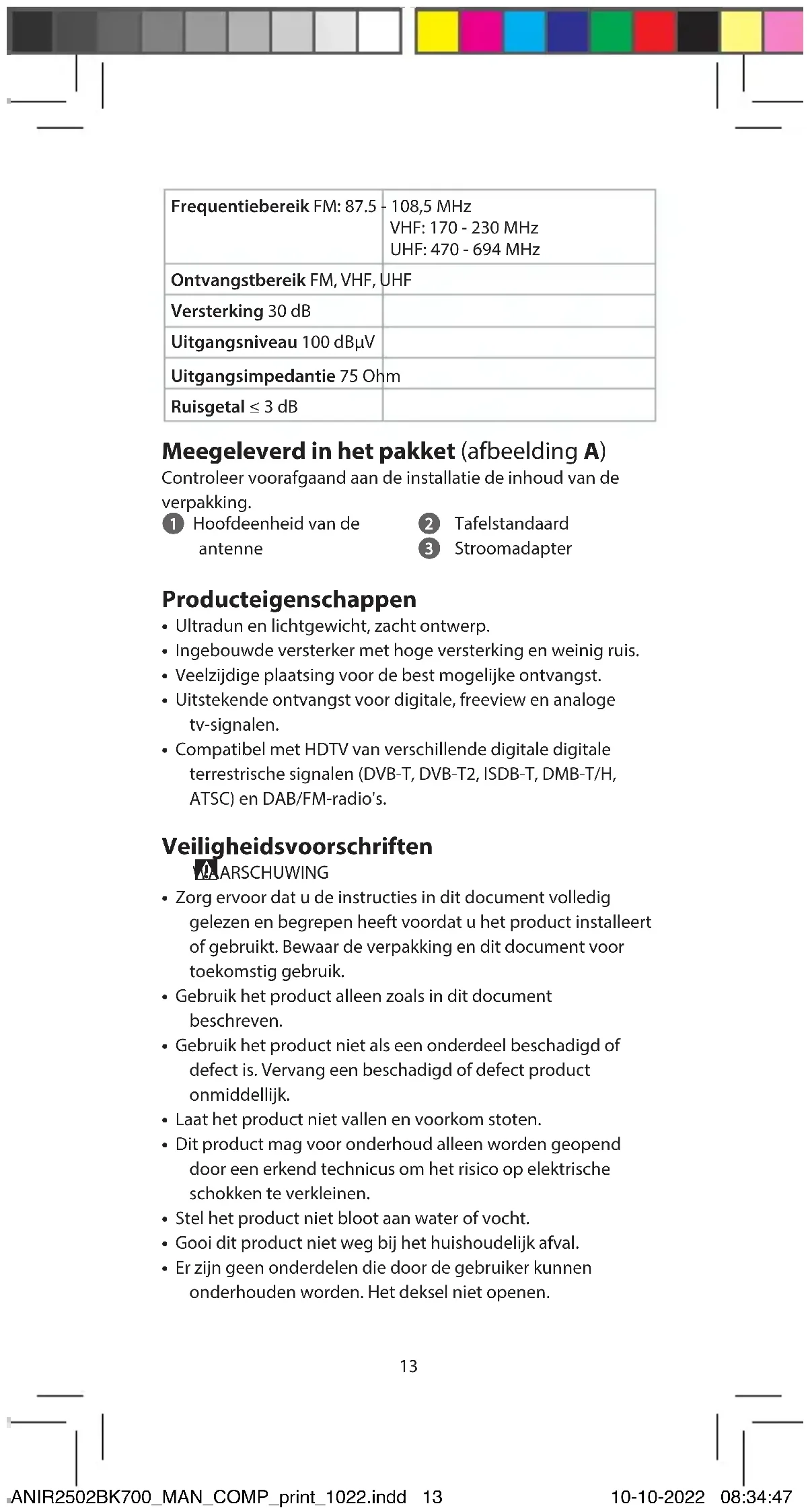 Snelstartgids TV-antenne voor binnen ANIR2502BK700 Bedoeld gebruik Het product is een antenne die gebruikt kan worden met een tv of settopbox die voeding via de coaxkabel ondersteunt. Dit is een antenne die speciaal is ontworpen voor ontvangst van digitale terrestrische tv-uitzendingen. Het product is enkel bedoeld voor gebruik binnenshuis. Technische gegevens Product TV-antenne voor binnen Artikelnummer ANIR2502BK700 Ingangsvermogen AC/DC-adapter: 5.0 VDC ; 200
