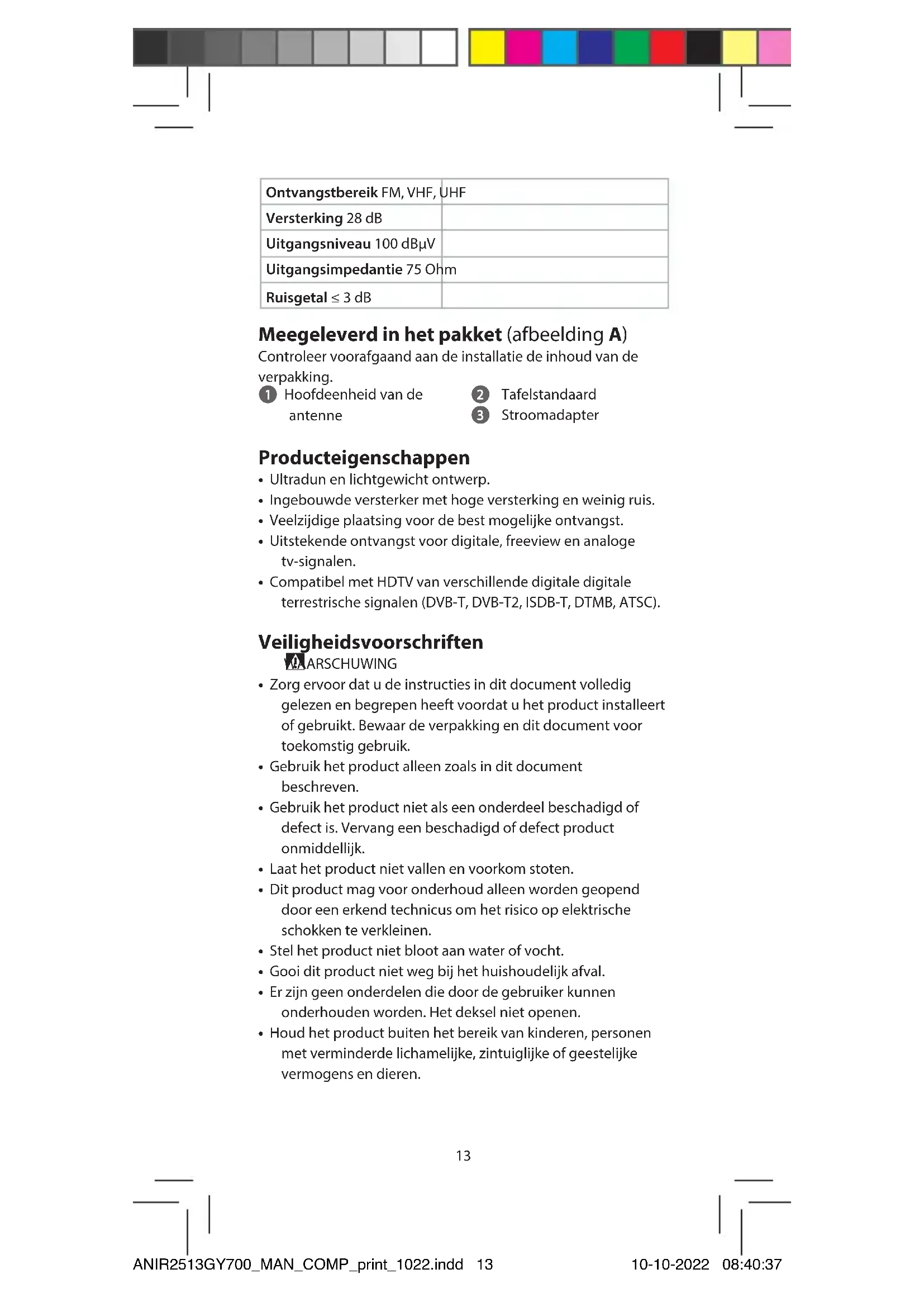 Snelstartgids TV-antenne voor binnen ANIR2513GY700 Bedoeld gebruik Dit is een antenne die speciaal is ontworpen voor ontvangst van digitale terrestrische tv-uitzendingen. Het product is een antenne die gebruikt kan worden met een tv of settopbox die voeding via de coaxkabel ondersteunt. Het product is enkel bedoeld voor gebruik binnenshuis. Technische gegevens Product TV-antenne voor binnen Artikelnummer ANIR2513GY700 Ingangsvermogen AC/DC-adapter: 12 VDC ; 200 mA DTV-settopbox: 5.0 VDC ; 40 mA Frequentiebereik VHF: 87.5 - 230 MHz UHF: 470 - 694 MHz ANIR2513GY700_MAN_COMP_print_1022.indd 12ANIR2513GY700_MAN_COMP_print_1022.indd 12 10-10-2022 08:40:3710-10-2022 08:40:3713 Ontvangstbereik FM, VHF, UHF Versterking 28 dB Uitgangsniveau 100 dBµV Uitgangsimpedantie 75 Ohm Ruisgetal ≤ 3 dB Meegeleverd in het pakket (afbeelding A) Controleer voorafgaand aan de installatie de inhoud van de verpakking. 1 Hoofdeenheid van de antenne 2 Tafelstandaard 3 Stroomadapter Producteigenschappen