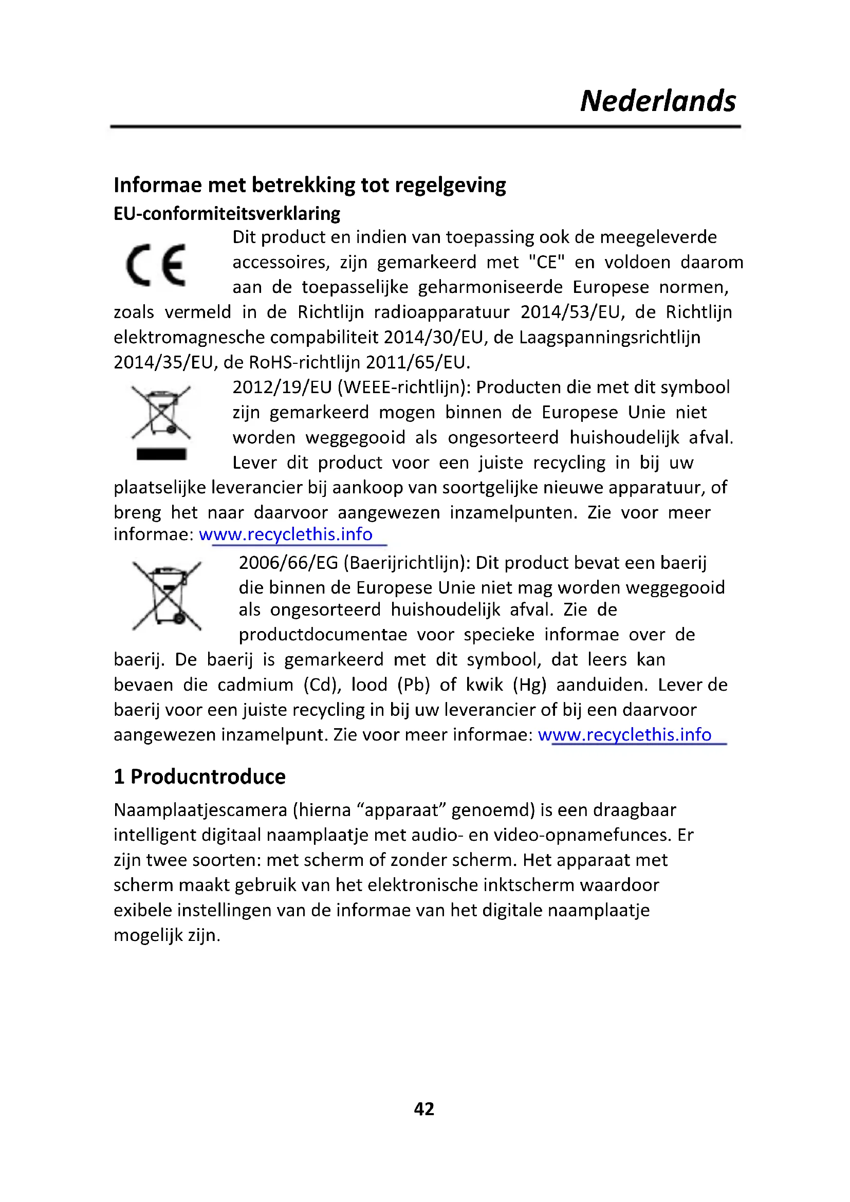 Informatie met betrekking tot regelgeving EU-conformiteitsverklaring Dit product en indien van toepassing ook de meegeleverde accessoires, zijn gemarkeerd met "CE" en voldoen daarom aan de toepasselijke geharmoniseerde Europese normen, zoals vermeld in de Richtlijn radioapparatuur 2014/53/EU, de Richtlijn elektromagnetische compatibiliteit 2014/30/EU, de Laagspanningsrichtlijn 2014/35/EU, de RoHS-richtlijn 2011/65/EU. 2012/19/EU (WEEE-richtlijn): Producten die met dit symbool zijn gemarkeerd mogen binnen de Europese Unie niet worden weggegooid als ongesorteerd huishoudelijk afval. Lever dit product voor een juiste recycling in bij uw plaatselijke leverancier bij aankoop van soortgelijke nieuwe apparatuur, of breng het naar daarvoor aangewezen inzamelpunten. Zie voor meer informatie: www.recyclethis.info 2006/66/EG (Batterijrichtlijn): Dit product bevat een batterij die binnen de Europese Unie niet mag worden weggegooid als ongesorteerd huishoudelijk afval. Zie de productdocumentatie voor specifieke informatie over de batterij. De batterij is gemarkeerd met dit symbool, dat letters kan bevatten die cadmium (Cd), lood (Pb) of kwik (Hg) aanduiden. Lever de batterij voor een juiste recycling in bij uw leverancier of bij een daarvoor aangewezen inzamelpunt. Zie voor meer informatie: www.recyclethis.info 1 Productintroductie Naamplaatjescamera (hierna “apparaat” genoemd) is een draagbaar intelligent digitaal naamplaatje met audio- en video-opnamefuncties. Er zijn twee soorten: met scherm of zonder scherm. Het apparaat met scherm maakt gebruik van het elektronische inktscherm waardoor flexibele instellingen van de informatie van het digitale naamplaatje mogelijk zijn.Nederlands