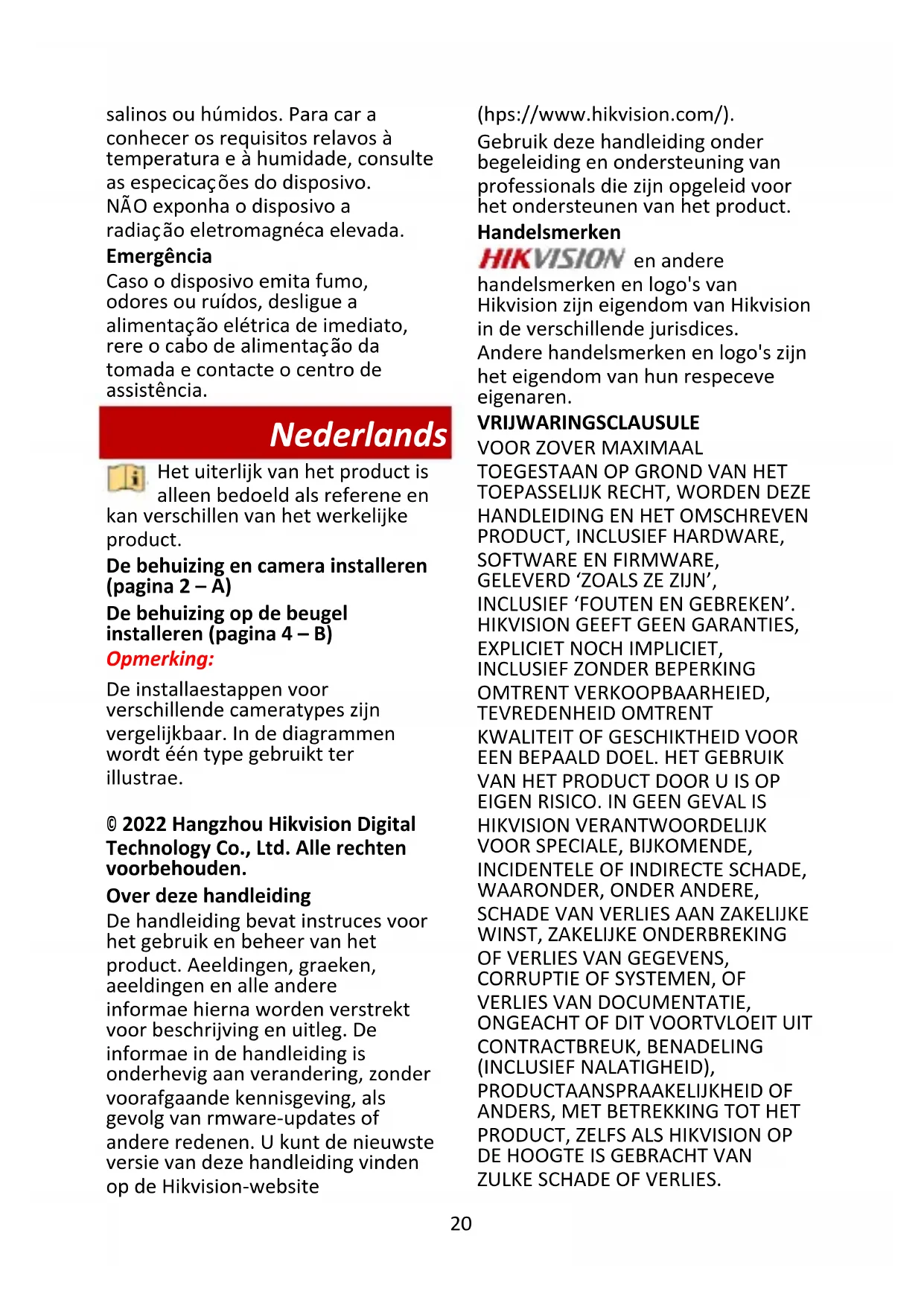 Veiligheidsinstructies Waarschuwingen Wet- en regelgeving Het apparaat moet worden gebruikt in overeenstemming met lokale wetgeving, elektrische veiligheidsvoorschriften en voorschriften voor brandpreventie. Elektrische veiligheid LET OP: Vervang de zekering uitsluitend door een exemplaar van hetzelfde type en vermogen om het risico van brand te reduceren. Voorzichtigheden Brandveiligheid Plaats geen bronnen met open vuur, zoals brandende kaarsen, op het apparaat. Installatie Installeer de apparatuur volgens de instructies in deze handleiding. Om letsel te voorkomen moet deze apparatuur in overeenstemming met de installatie-instructies stevig aan het plafond of de muur worden bevestigd. Zorg ervoor dat er voldoende ruimte is om het apparaat en de accessoires te installeren. Zorg ervoor dat de muur sterk genoeg is om minstens 8 keer het gewicht van het apparaat en de22 houder te kunnen dragen. Controleer eerst of de voeding is losgekoppeld voor u het apparaat bekabelt, installeert of demonteert. Transport Bewaar het apparaat in de originele of soortgelijke verpakking tijdens vervoer. Laat het product niet vallen en stel het apparaat niet bloot aan schokken. Stroomvoorziening Gebruik een door een gekwalificeerde fabrikant geleverde netstroomadapter. Het wordt aanbevolen om voor elk apparaat een onafhankelijke netstroomadapter te gebruiken, aangezien overbelasting van de adapter oververhitting of brandgevaar kan veroorzaken. Onderhoud Als het product niet goed werkt, neem dan contact op met uw leverancier of het dichtstbijzijnde servicecentrum. Wij aanvaarden geen verantwoordelijkheid voor problemen die zijn veroorzaakt door ongeautoriseerde reparatie of onderhoud. Een paar componenten vereisen regelmatige vervanging. De gemiddelde levensduur varieert, dus periodieke controle wordt aanbevolen. Neem contact op met uw leverancier voor meer informatie. Reiniging Gebruik een zachte en droge doek om de binnenkant en buitenkant te reinigen. Gebruik geen alkalische reinigingsmiddelen. Gebruiksomgeving Wanneer laserapparatuur in gebruik is, zorg er dan voor dat de lens van het apparaat niet wordt blootgesteld aan de laserstraal, anders kan deze doorbranden. Richt het behuizingsvenster niet naar de zon of een ander fel licht. Om warmteophoping te voorkomen is goede ventilatie vereist voor een juiste bedrijfsomgeving. Stel het apparaat niet bloot aan extreem warme, koude, stoffige, corrosieve, zout-alkalische of vochtige omgevingen. Zie voor temperatuur- en luchtvochtigheidsvereisten de apparaatspecificaties. Stel het apparaat NIET bloot aan hoge elektromagnetische straling. Noodgeval Als er rook, geur of geluid uit het apparaat komt, schakel het dan onmiddellijk uit, haal de stekker van het netsnoer uit het stopcontact en neem contact op met het servicecentrum. Čeština Vzhled výrobku slouží pouze jako reference a může se od skutečného výrobku lišit. Montáž krytu a kamery (strana 2 – A) Montáž krytu na držák (strana 4 – B) Poznámka: Kroky instalace pro různé typy kamer jsou podobné. Na diagramech se pro ilustraci používá jeden typ. © 2022 Hangzhou Hikvision Digital Technology Co., Ltd. Všechna práva vyhrazena. Informace o tomto návodu V návodu jsou obsaženy pokyny k používání a obsluze výrobku. Obrázky, schémata, snímky a veškeré ostatní zde uvedené informace slouží pouze jako popis a vysvětlení. Informace obsažené v tomto návodu podléhají vzhledem k aktualizacím firmwaru nebo z jiných důvodů změnám bez upozornění. Nejnovější23 verzi tohoto návodu naleznete na webových stránkách společnosti Hikvision (https://www.hikvision.com/). Tento návod používejte s vedením a pomocí odborníků vyškolených v oblasti podpory výrobku. Ochranné známky a ostatní ochranné známky a loga společnosti Hikvision jsou vlastnictvím společnosti Hikvision v různých jurisdikcích. Ostatní ochranné známky a loga uvedené v této příručce jsou majetkem příslušných vlastníků.