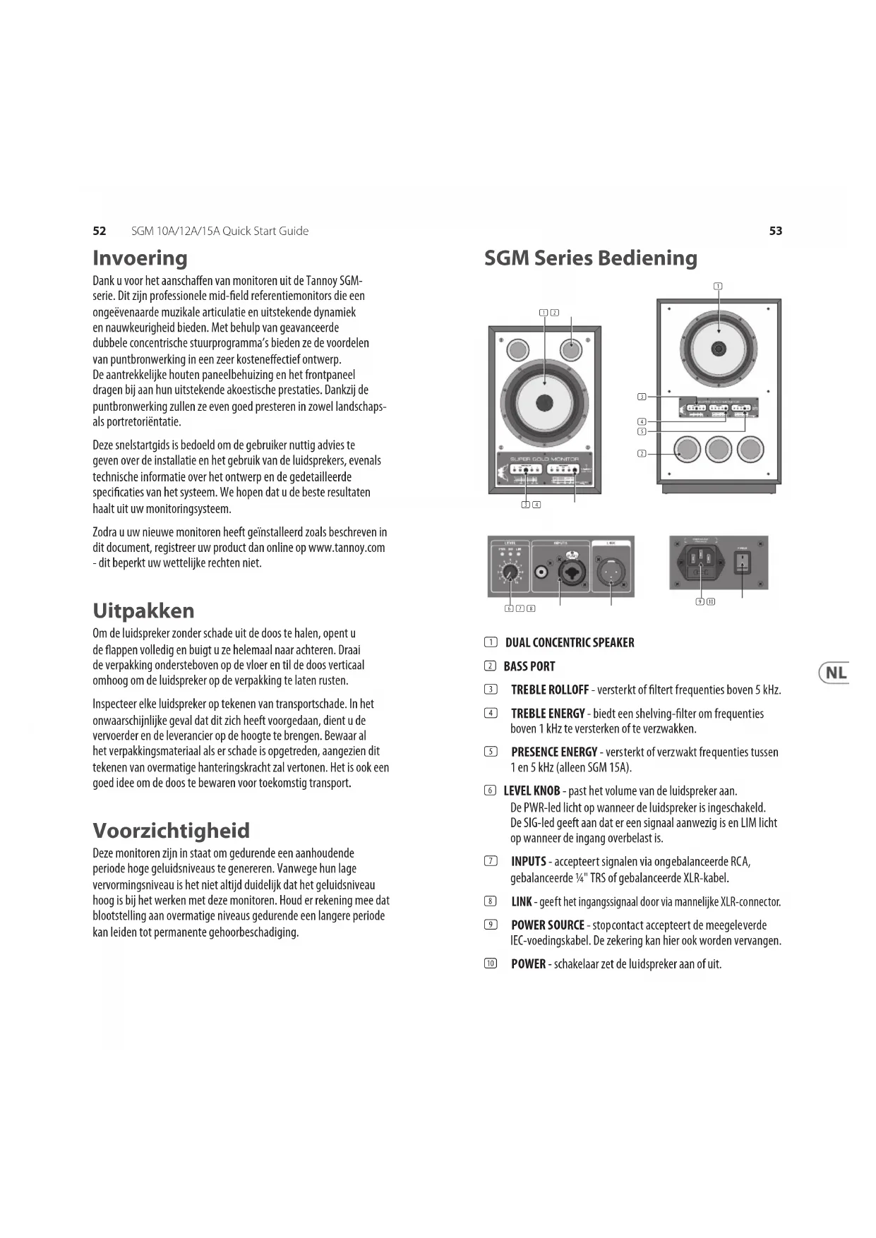 Invoering Dank u voor het aanschaen van monitoren uit de Tannoy SGM- serie. Dit zijn professionele mid-eld referentiemonitors die een ongeëvenaarde muzikale articulatie en uitstekende dynamiek en nauwkeurigheid bieden. Met behulp van geavanceerde dubbele concentrische stuurprogramma’s bieden ze de voordelen van puntbronwerking in een zeer kosteneectief ontwerp. De aantrekkelijke houten paneelbehuizing en het frontpaneel dragen bij aan hun uitstekende akoestische prestaties. Dankzij de puntbronwerking zullen ze even goed presteren in zowel landschaps- als portretoriëntatie. Deze snelstartgids is bedoeld om de gebruiker nuttig advies te geven over de installatie en het gebruik van de luidsprekers, evenals technische informatie over het ontwerp en de gedetailleerde specicaties van het systeem. We hopen dat u de beste resultaten haalt uit uw monitoringsysteem. Zodra u uw nieuwe monitoren heeft geïnstalleerd zoals beschreven in dit document, registreer uw product dan online op www.tannoy.com - dit beperkt uw wettelijke rechten niet. Uitpakken Om de luidspreker zonder schade uit de doos te halen, opent u de appen volledig en buigt u ze helemaal naar achteren. Draai de verpakking ondersteboven op de vloer en til de doos verticaal omhoog om de luidspreker op de verpakking te laten rusten. Inspecteer elke luidspreker op tekenen van transportschade. In het onwaarschijnlijke geval dat dit zich heeft voorgedaan, dient u de vervoerder en de leverancier op de hoogte te brengen. Bewaar al het verpakkingsmateriaal als er schade is opgetreden, aangezien dit tekenen van overmatige hanteringskracht zal vertonen. Het is ook een goed idee om de doos te bewaren voor toekomstig transport. Voorzichtigheid Deze monitoren zijn in staat om gedurende een aanhoudende periode hoge geluidsniveaus te genereren. Vanwege hun lage vervormingsniveau is het niet altijd duidelijk dat het geluidsniveau hoog is bij het werken met deze monitoren. Houd er rekening mee dat blootstelling aan overmatige niveaus gedurende een langere periode kan leiden tot permanente gehoorbeschadiging.