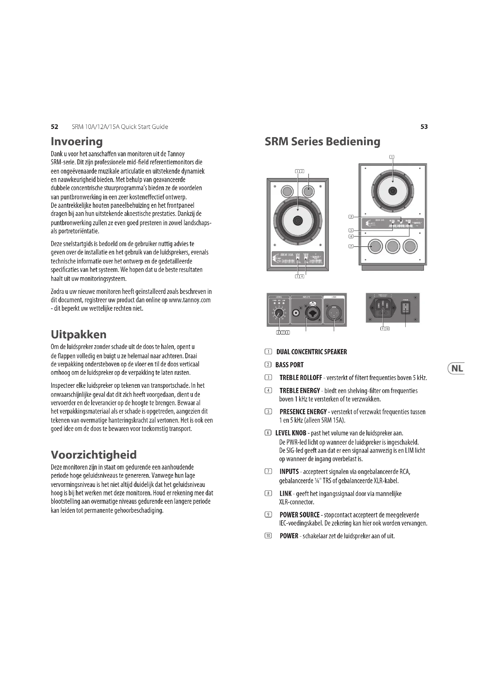 Invoering Dank u voor het aanschaen van monitoren uit de Tannoy SRM-serie. Dit zijn professionele mid-eld referentiemonitors die een ongeëvenaarde muzikale articulatie en uitstekende dynamiek en nauwkeurigheid bieden. Met behulp van geavanceerde dubbele concentrische stuurprogramma’s bieden ze de voordelen van puntbronwerking in een zeer kosteneectief ontwerp. De aantrekkelijke houten paneelbehuizing en het frontpaneel dragen bij aan hun uitstekende akoestische prestaties. Dankzij de puntbronwerking zullen ze even goed presteren in zowel landschaps- als portretoriëntatie. Deze snelstartgids is bedoeld om de gebruiker nuttig advies te geven over de installatie en het gebruik van de luidsprekers, evenals technische informatie over het ontwerp en de gedetailleerde specicaties van het systeem. We hopen dat u de beste resultaten haalt uit uw monitoringsysteem. Zodra u uw nieuwe monitoren heeft geïnstalleerd zoals beschreven in dit document, registreer uw product dan online op www.tannoy.com - dit beperkt uw wettelijke rechten niet. Uitpakken Om de luidspreker zonder schade uit de doos te halen, opent u de appen volledig en buigt u ze helemaal naar achteren. Draai de verpakking ondersteboven op de vloer en til de doos verticaal omhoog om de luidspreker op de verpakking te laten rusten. Inspecteer elke luidspreker op tekenen van transportschade. In het onwaarschijnlijke geval dat dit zich heeft voorgedaan, dient u de vervoerder en de leverancier op de hoogte te brengen. Bewaar al het verpakkingsmateriaal als er schade is opgetreden, aangezien dit tekenen van overmatige hanteringskracht zal vertonen. Het is ook een goed idee om de doos te bewaren voor toekomstig transport. Voorzichtigheid Deze monitoren zijn in staat om gedurende een aanhoudende periode hoge geluidsniveaus te genereren. Vanwege hun lage vervormingsniveau is het niet altijd duidelijk dat het geluidsniveau hoog is bij het werken met deze monitoren. Houd er rekening mee dat blootstelling aan overmatige niveaus gedurende een langere periode kan leiden tot permanente gehoorbeschadiging. (3) (4) (1) (2) (1) (2) (3) (4) (5) (6) (7) (8) (9) (10)