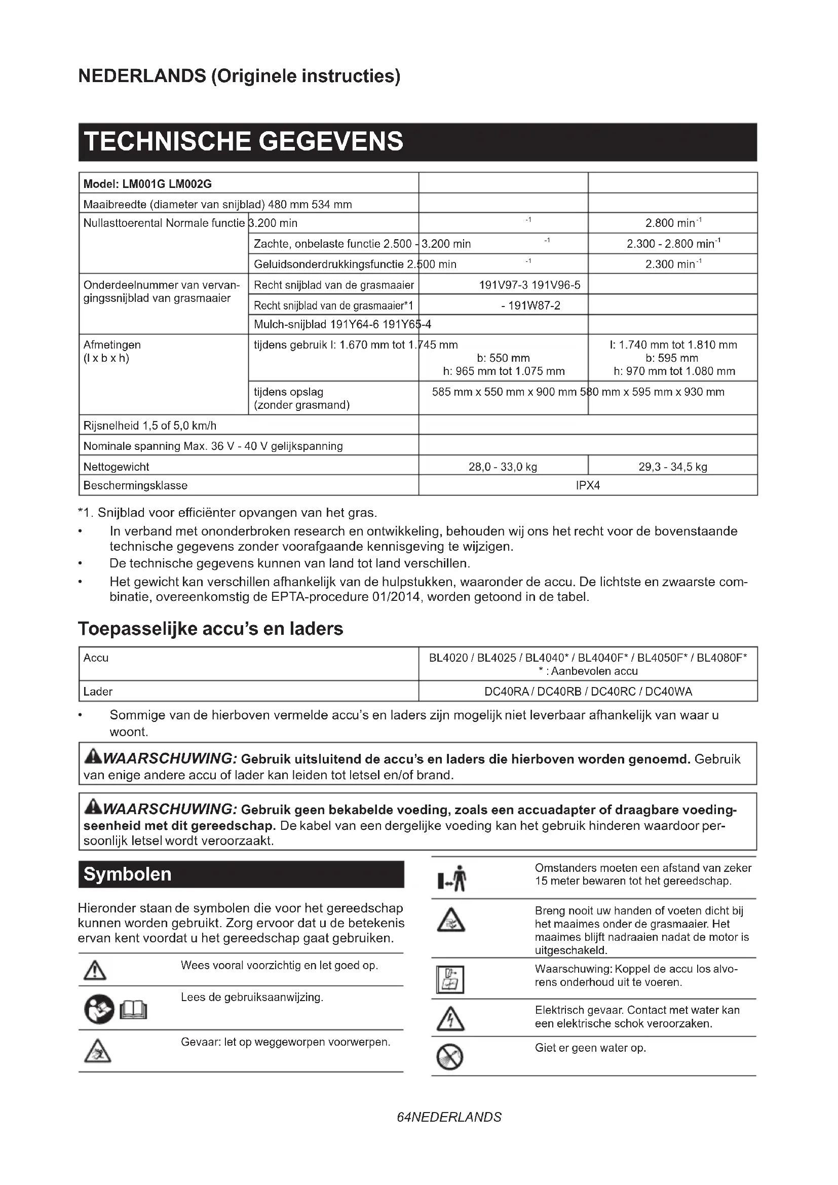 - Sommige van de hierboven vermelde accu’s en laders zijn mogelijk niet leverbaar afhankelijk van waar u woont. WAARSCHUWING: Gebruik uitsluitend de accu’s en laders die hierboven worden genoemd. Gebruik van enige andere accu of lader kan leiden tot letsel en/of brand. WAARSCHUWING: Gebruik geen bekabelde voeding, zoals een accuadapter of draagbare voeding- seenheid met dit gereedschap. De kabel van een dergelijke voeding kan het gebruik hinderen waardoor per- soonlijk letsel wordt veroorzaakt. Symbolen Hieronder staan de symbolen die voor het gereedschap kunnen worden gebruikt. Zorg ervoor dat u de betekenis ervan kent voordat u het gereedschap gaat gebruiken. Wees vooral voorzichtig en let goed op. Lees de gebruiksaanwijzing. Gevaar: let op weggeworpen voorwerpen. Omstanders moeten een afstand van zeker 15 meter bewaren tot het gereedschap. Breng nooit uw handen of voeten dicht bij het maaimes onder de grasmaaier. Het maaimes blijft nadraaien nadat de motor is uitgeschakeld. Waarschuwing: Koppel de accu los alvo- rens onderhoud uit te voeren. Elektrisch gevaar. Contact met water kan een elektrische schok veroorzaken. Giet er geen water op.65 NEDERLANDS Ni-MH Li-ionAlleen voor EU-landenAls gevolg van de aanwezigheid van schade-lijke componenten in het apparaat, kunnen oude elektrische en elektronische apparaten, accu‘s en batterijen negatieve gevolgen hebben voor het milieu en de gezondheid van mensen.Gooi elektrische en elektronische appara-ten en accu‘s niet met het huisvuil weg!In overeenstemming met de Europese richtlijn inzake oude elektrische en elektronische apparaten en inzake accu‘s en batterijen en oude accu‘s en batterijen, alsmede de toepassing daarvan binnen de nationale wetgeving, dienen oude elektrische apparaten, accu‘s en batterijen gescheiden te worden opgeslagen en te worden ingeleverd bij een apart inzamelingspunt voor huishoudelijk afval dat de milieubeschermingsvoorschriften in acht neemt.Dit wordt op het apparaat aangegeven door het symbool van een doorgekruiste afvalcontainer.Gegarandeerd geluidsvermogenniveau conform EU-richtlijn inzake geluidsemissie buitenhuis.Geluidsvermogenniveau conform de Regelgeving Geluidsregeling van NSW, Australië Gebruiksdoeleinden De machine is bedoeld om het gazon te maaien. Geluidsniveau De typische, A-gewogen geluidsniveaus zijn gemeten volgens EN62841-4-3: Model LM001G Gemeten geluidsvermogenniveau (L