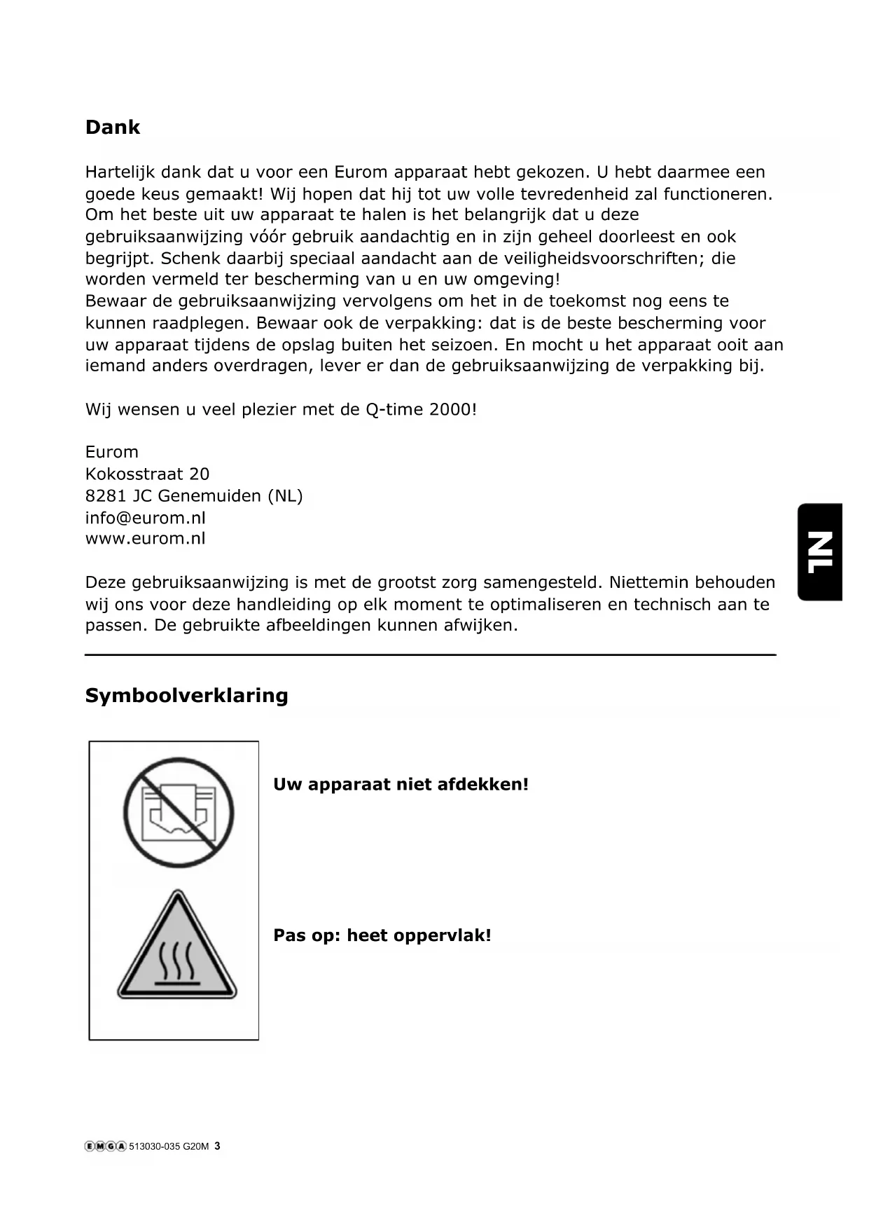 Modelnr.:*513.030 - *513.035 ENNL FRDENL 513030-035 G20M 2 Gebruiksaanwijzing Instruction manual Gebrauchsanleitung Manuel d’utilisation (pag. 3) (page 12) (Seite 20) (page 29) Q-time 2000 / 2000S Art.nr. 334227 / Art.nr. 334203 334210 (Swiss plug) Terrasstraler / Patioheater / Terrassenstrahler / Chauffage de terrasse 18-06-2019NL 513030-035 G20M 3 Dank Hartelijk dank dat u voor een Eurom apparaat hebt gekozen. U hebt daarmee een goede keus gemaakt! Wij hopen dat hij tot uw volle tevredenheid zal functioneren. Om het beste uit uw apparaat te halen is het belangrijk dat u deze gebruiksaanwijzing vóór gebruik aandachtig en in zijn geheel doorleest en ook begrijpt. Schenk daarbij speciaal aandacht aan de veiligheidsvoorschriften; die worden vermeld ter bescherming van u en uw omgeving! Bewaar de gebruiksaanwijzing vervolgens om het in de toekomst nog eens te kunnen raadplegen. Bewaar ook de verpakking: dat is de beste bescherming voor uw apparaat tijdens de opslag buiten het seizoen. En mocht u het apparaat ooit aan iemand anders overdragen, lever er dan de gebruiksaanwijzing de verpakking bij. Wij wensen u veel plezier met de Q-time 2000! Eurom Kokosstraat 20 8281 JC Genemuiden (NL) info@eurom.nl www.eurom.nl Deze gebruiksaanwijzing is met de grootst zorg samengesteld. Niettemin behouden wij ons voor deze handleiding op elk moment te optimaliseren en technisch aan te passen. De gebruikte afbeeldingen kunnen afwijken.