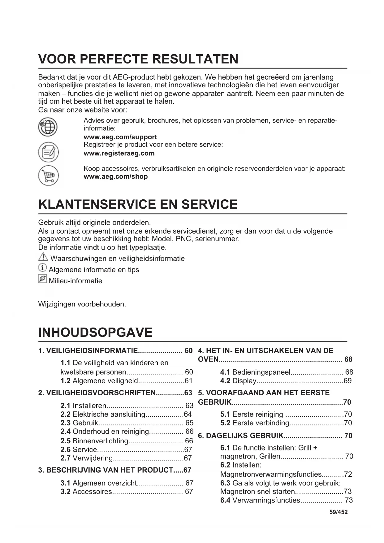 Gebruik altijd originele onderdelen. Als u contact opneemt met onze erkende servicedienst, zorg er dan voor dat u de volgende gegevens tot uw beschikking hebt: Model, PNC, serienummer. De informatie vindt u op het typeplaatje. Waarschuwingen en veiligheidsinformatie Algemene informatie en tips Milieu-informatie Wijzigingen voorbehouden. INHOUDSOPGAVE
