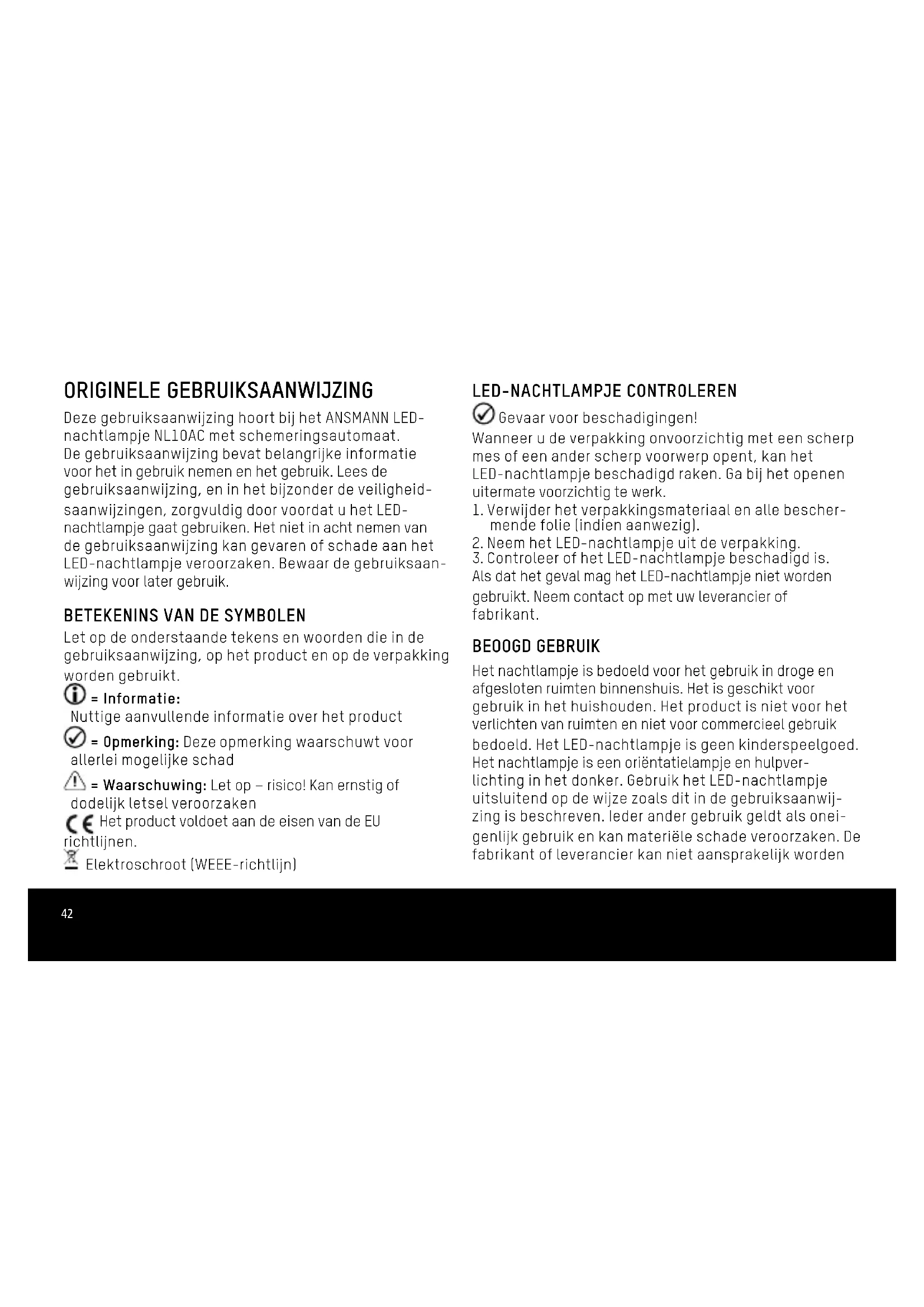 De in deze gebruiksaanwijzing opgenomen informatie kan zonder aankondiging vooraf gewijzigd worden. Wij aanvaarden geen aansprakelijkheid voor directe, indi- recte, toevallige of overige schade of vervolgschade, die door ondeskundig gebruik of door het niet naleven van de in deze gebruiksaanwijzing aanwezige informatie ontstaat. Bij verkeerd gebruik van het product aanvaar- den wij geen aansprakelijkheid en verlenen wij geen garantieaanspraken. GARANTIE-OPMERKING Onze garantiebepalingen vindt u online op www. ansmann.de. Bij schade aan het apparaat, die ten gevolge van het niet naleven van de gebruiksaanwij- zing ontstaat, kan geen garantie verleend worden. Uw wettelijke aanspraak op garantie wordt hierdoor niet nadelig beïnvloed. Technische wijzigingen voorbehouden. Voor drukfouten zijn wij niet aansprakelijk. Deutsch | English | Français | Español | Português | Svenska Italiano | Nederlands | Dansk | Suomi | Norsk48 ORIGINAL-BETJENINGSVEJLEDNING Denne betjeningsvejledning hører til ANSMANN LED-nat- lampe NLÆ10AC med skumringsautomatik. Den indeholder vigtige oplysninger vedrørende ibrug- tagning og håndtering. Læs betjeningsvejledningen, især sikkerhedsanvisningerne, omhyggeligt igennem, inden du bruger LED-natlampen. Manglende overhol- delse af denne betjeningsvejledning kan medføre en fare eller skader på LED-natlampen. Opbevar denne betjeningsvejledningen til senere brug. SIGNATURFORKLARING Bemærk følgende symboler og ord, der anvendes på produktet og på emballagen. = Information: Nyttig ekstrainformation til produktet = Henvisning: Denne henvisning advarer mod alle typer mu!ige skader = Waarschuwing: Pas på– fare! Kan medføre alvorlige kvæstelser eller livsfare Produktet overholder kravene i EU direktiverne. Elektroskrot (WEEE-direktiv)