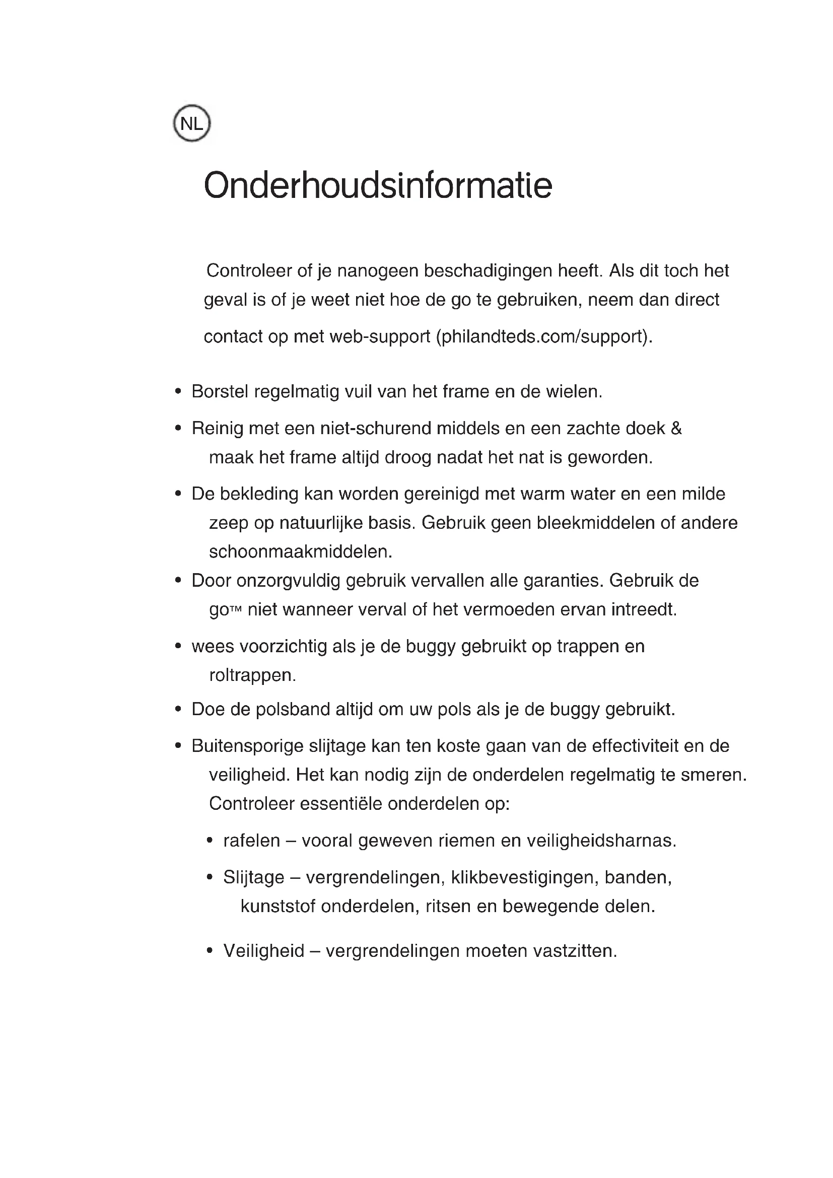 - Veiligheid – vergrendelingen moeten vastzitten. Controleer of je nanogeen beschadigingen heeft. Als dit toch het geval is of je weet niet hoe de go te gebruiken, neem dan direct contact op met web-support (philandteds.com/support).